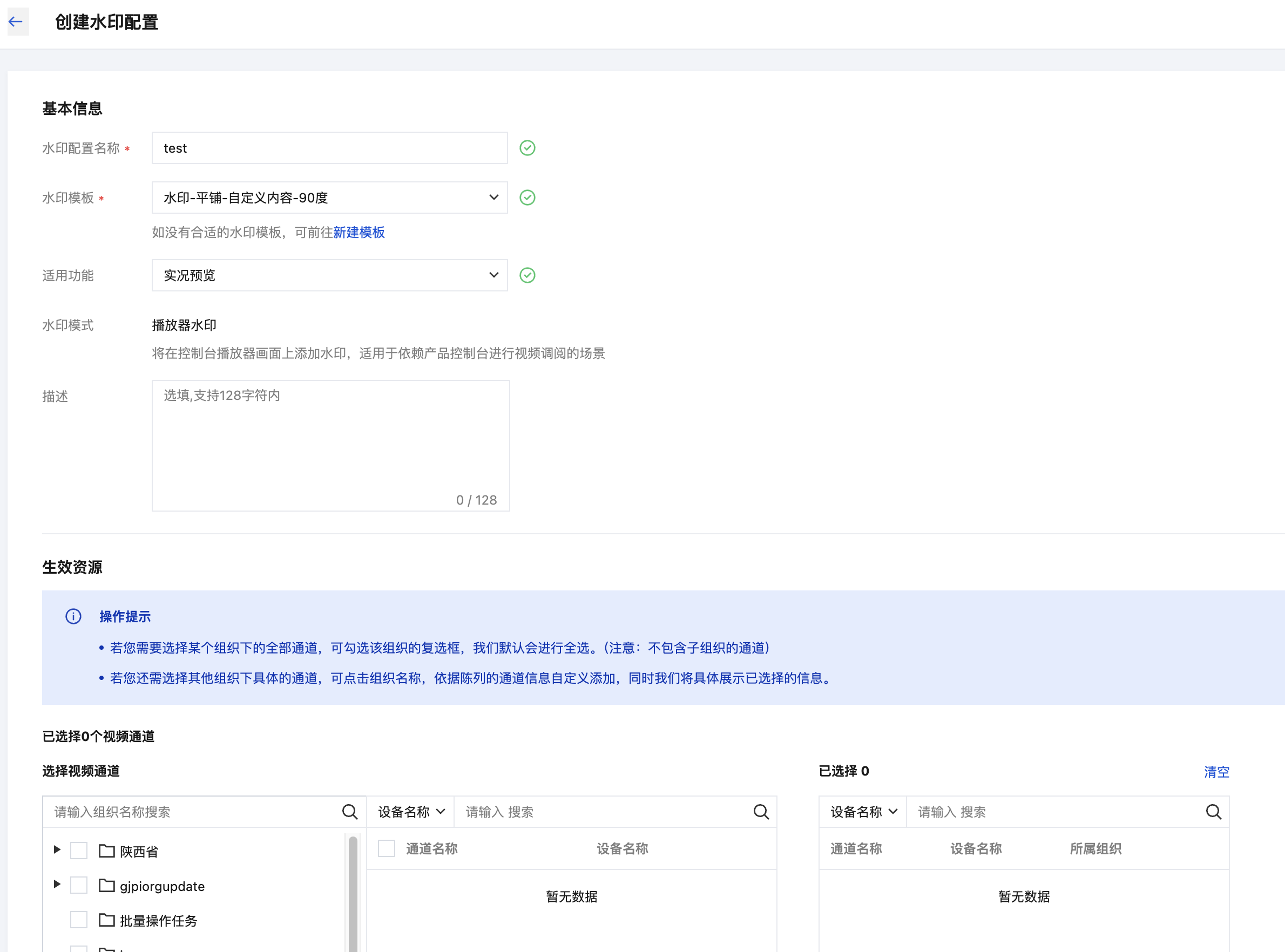 生效资源指视频通道,单个通道的单种功能只能关联在一个水印配置中。