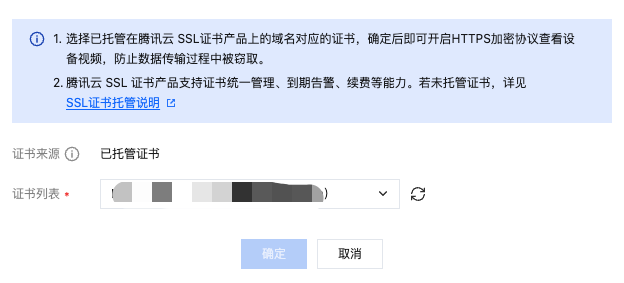 1. 此处请选择您已在腾讯云 SSL 证书产品上托管的证书,单击确定后,证书将自动部署至本产品资源中,随后您的客户端将能够通过 HTTPS 加密协议调阅视频,从而确保数据的安全性。