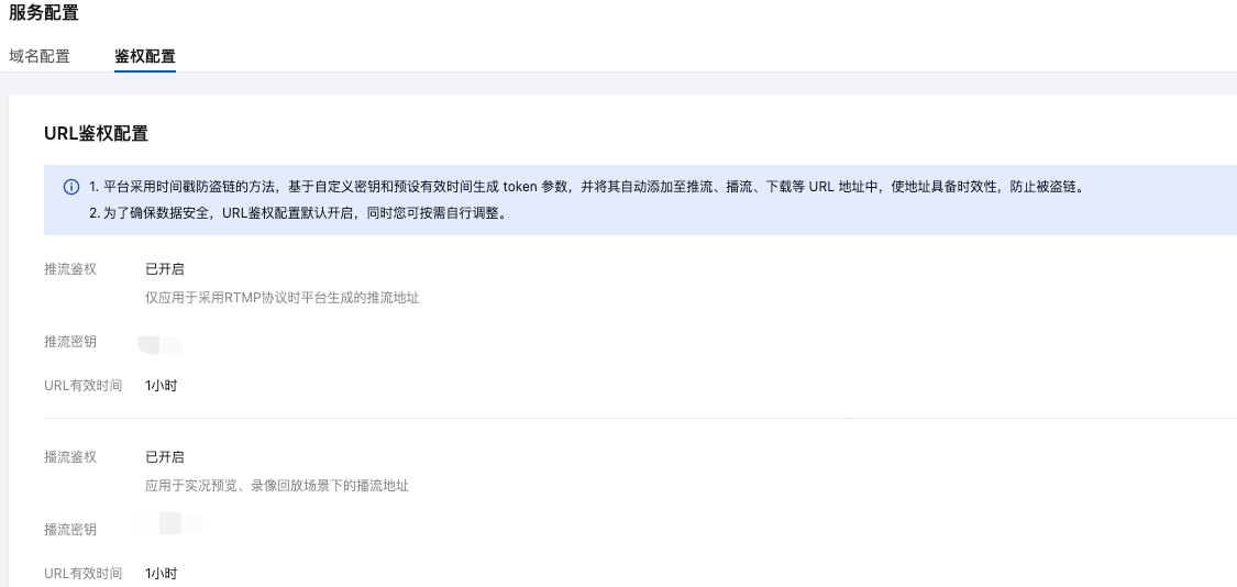 2. 自定义填写推流密钥和播流密钥内容、URL 有效时间(指播流地址的有效时间,例如:设置为10分钟,则在第二次重新播放该地址时,超过10分钟则失效无法播放,进一步防止数据泄漏)。