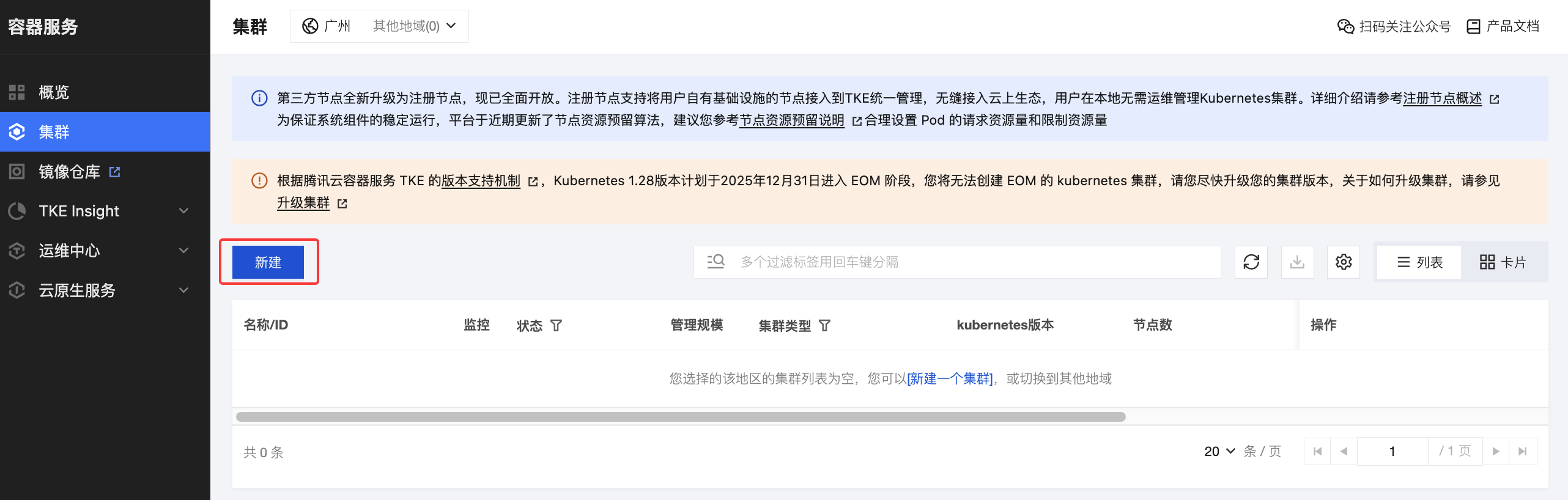 1. 登录 容器服务控制台,在集群列表选择目标地域,单击新建。