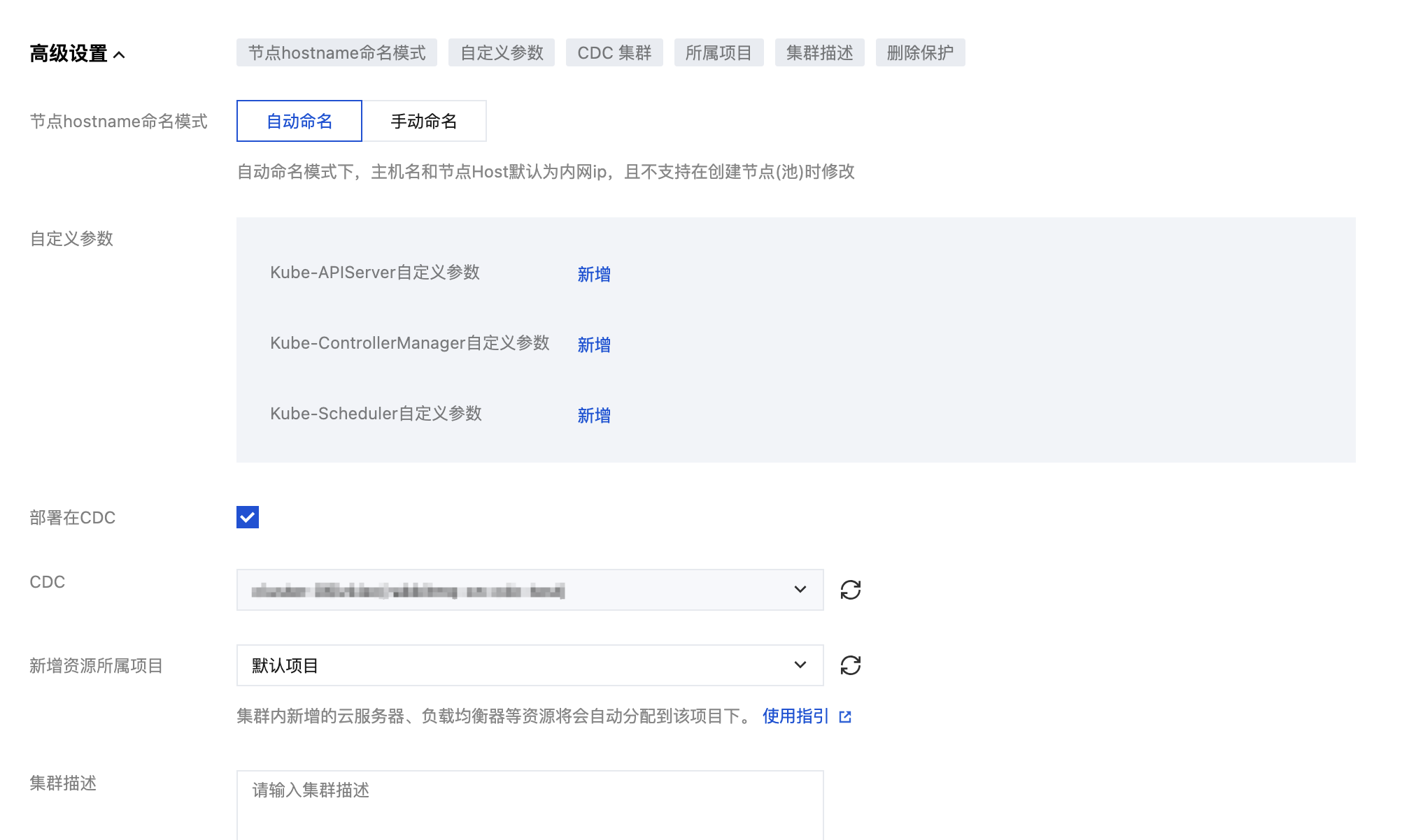 2. 在创建集群页面,按照指引完成集群信息配置、网络配置和组件配置。其中,在集群信息步骤,单击高级设置,勾选部署在 CDC,并选择您要部署的 CDC 集群。其他配置信息与创建 TKE 容器服务集群一致,详情请参见 创建集群。