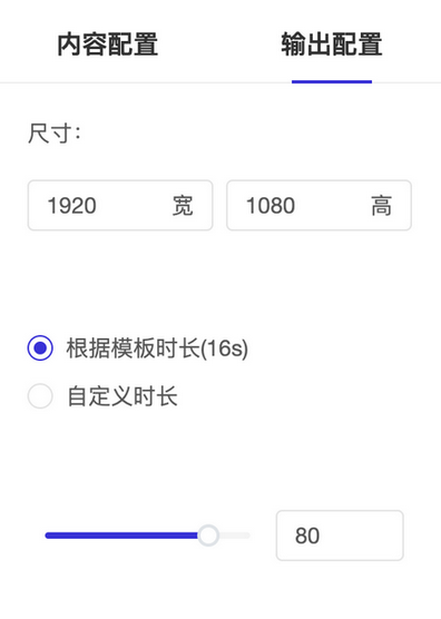 5. 视频内容编辑完成后,您可单击操作面板的”输出配置“区,对视频尺寸、时长、视频质量进行调整;n