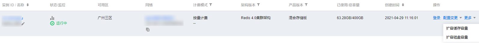 1. 登录 Tendis 控制台,选择对应地域,在实例列表选择所需实例,在操作列选择配置变更 > 扩容缓存容量或扩容磁盘容量。