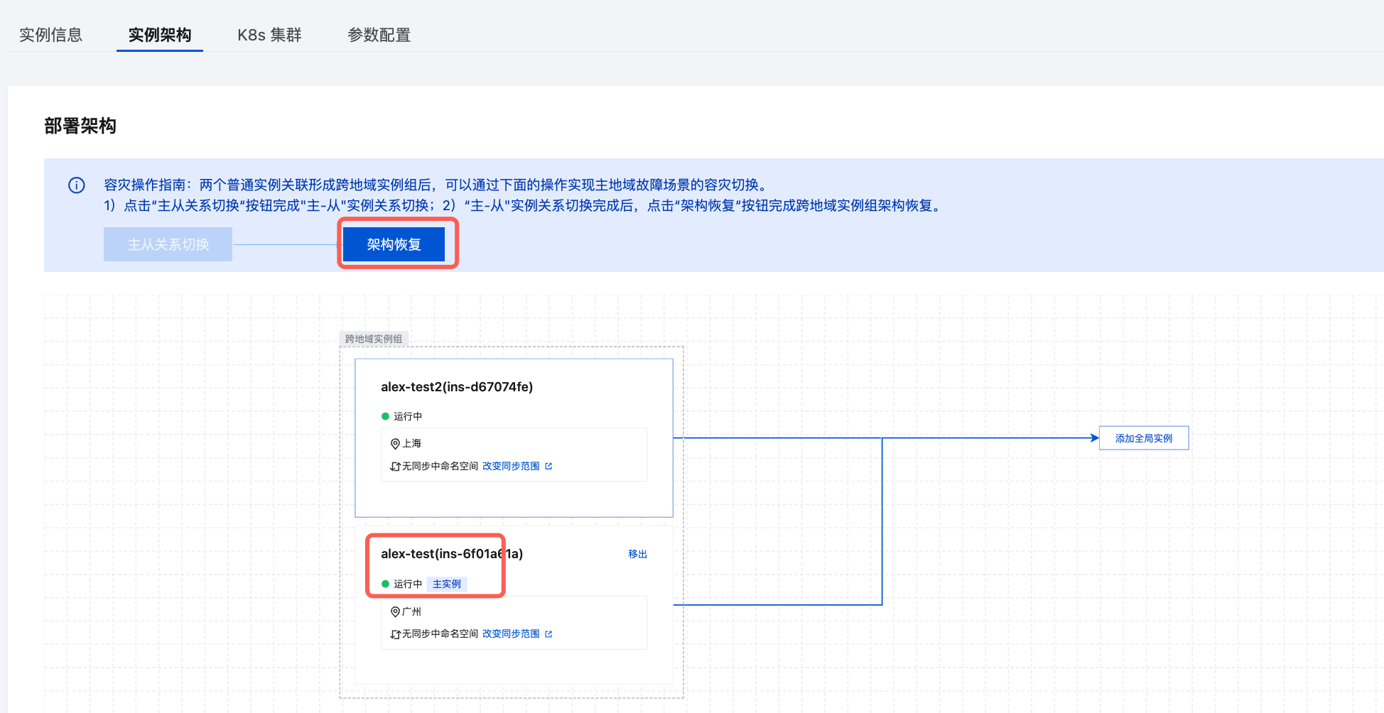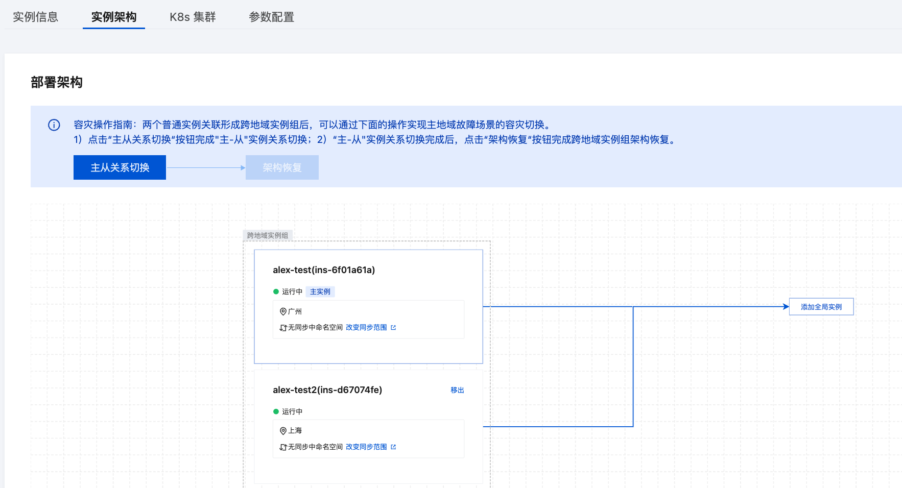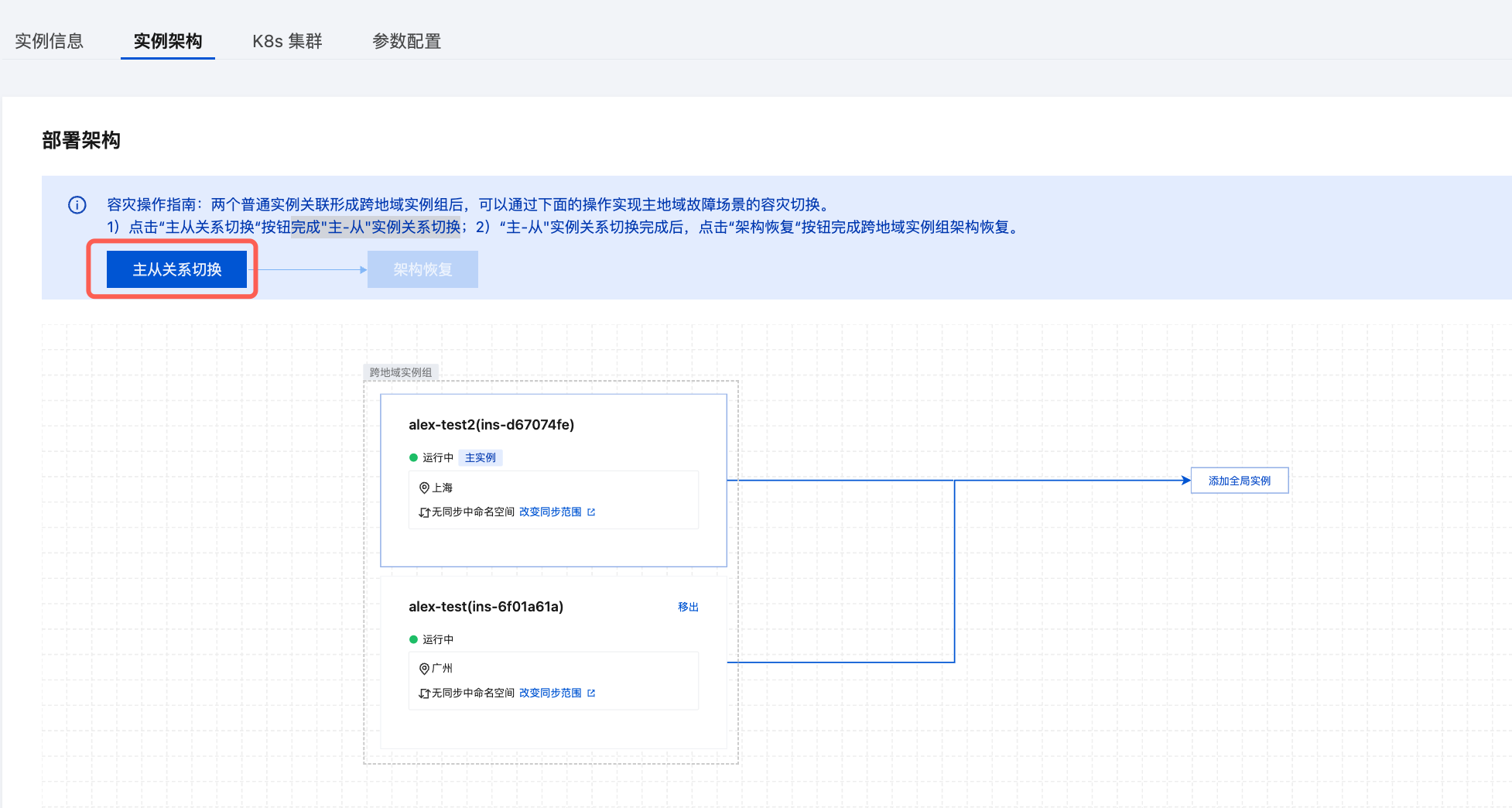 使用场景:形成跨地域实例组后,当主地域发生故障后,支持在此页面进行主-从地域切换及架构恢复操作。
