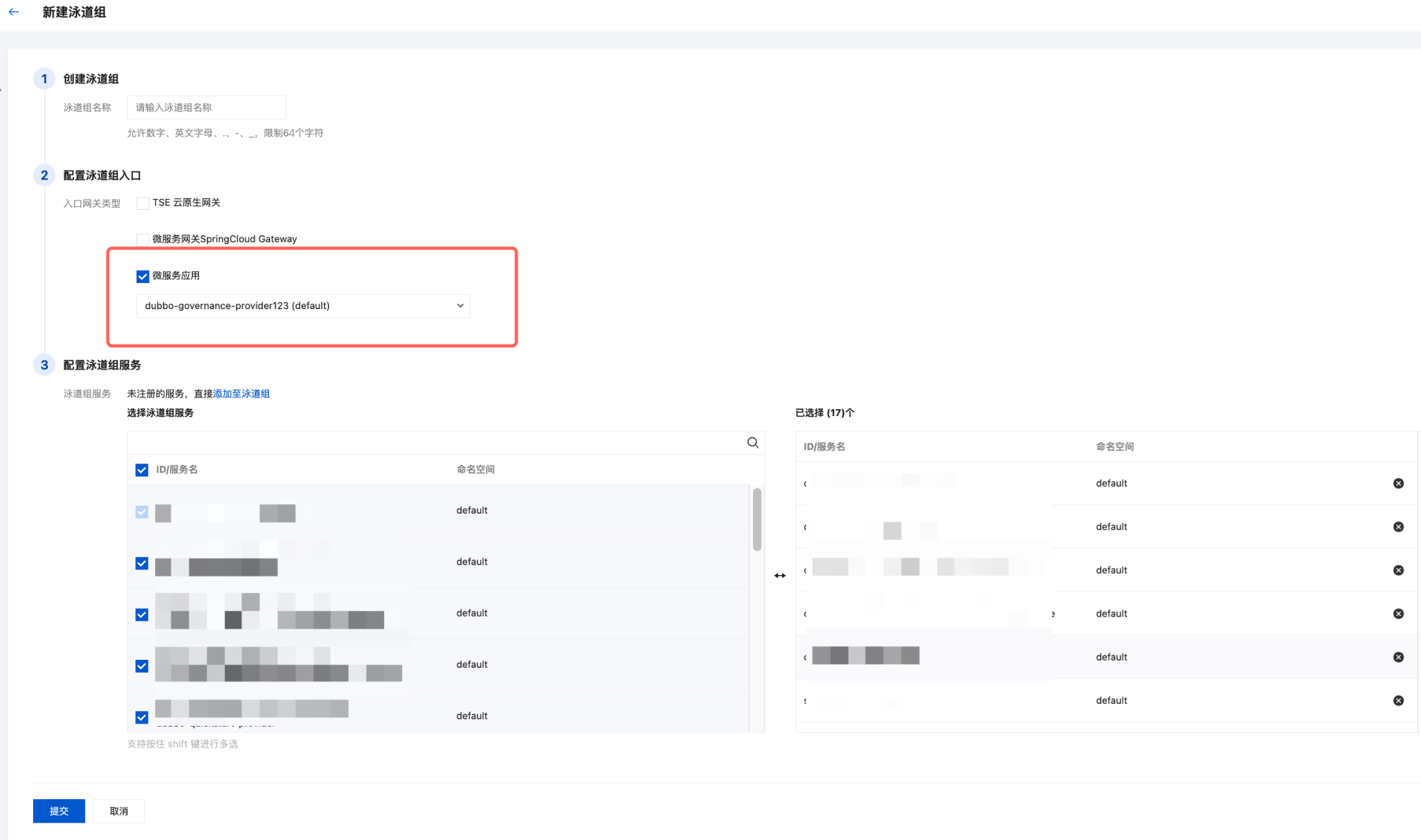 云原生网关:选择与北极星在相同地域和 VPC 下的网关实例,并选择业务系统入口服务。入口服务支持多选。