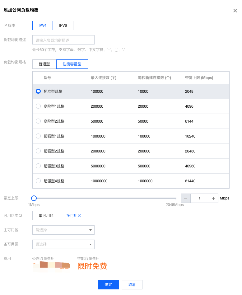 内网和公网负载均衡支持选择负载均衡规格,单击添加负载均衡后,设置好负载均衡规格,单击确定即可。