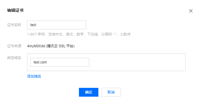 2. 在弹窗中输入证书名称和绑定域名,单击确定,完成修改。