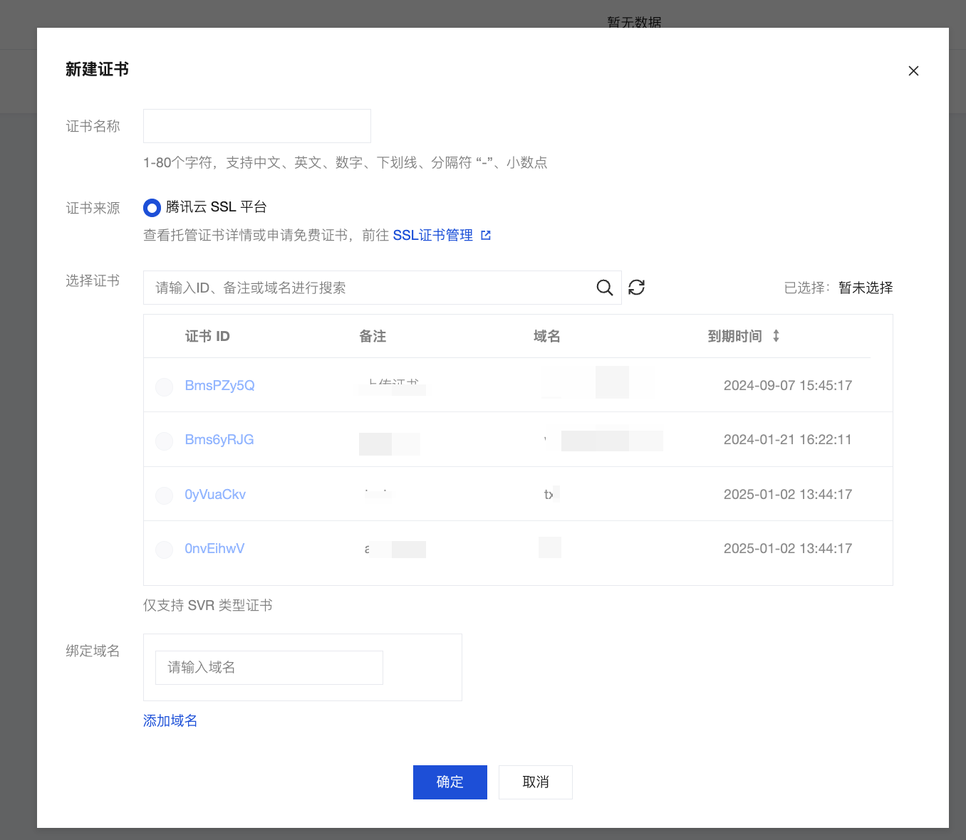 2. 在弹窗中输入证书名称和绑定域名,单击确定,完成修改。