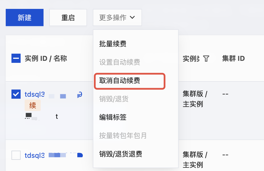 在实例列表中选择一个或多个实例,在上方选择更多操作 > 取消自动续费。