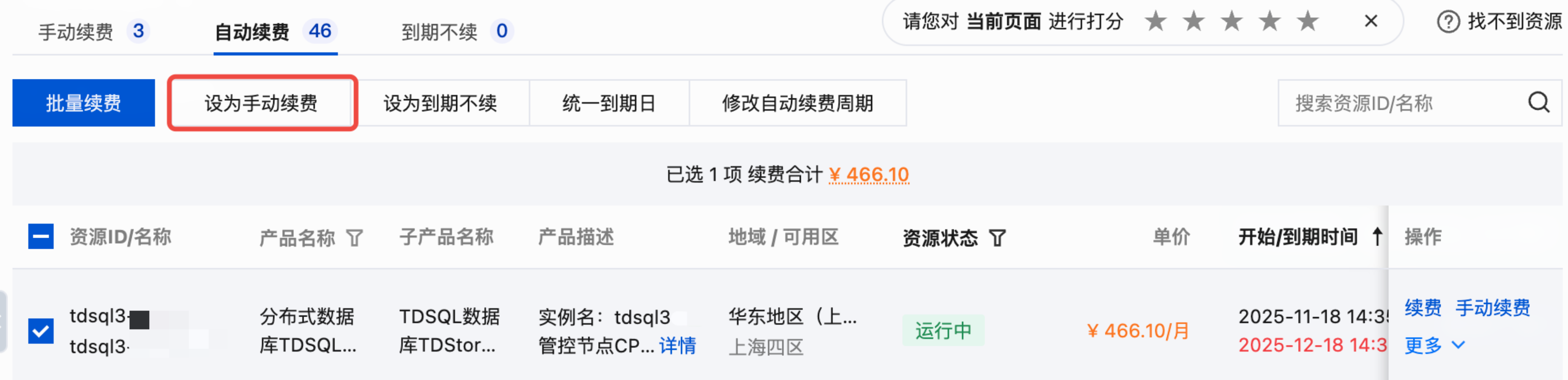 2. 在自动续费项下面,找到您想要取消自动续费的一个或多个资源 ID 开头为 “tdsql3-” 的实例,勾选后单击设为手动续费。
