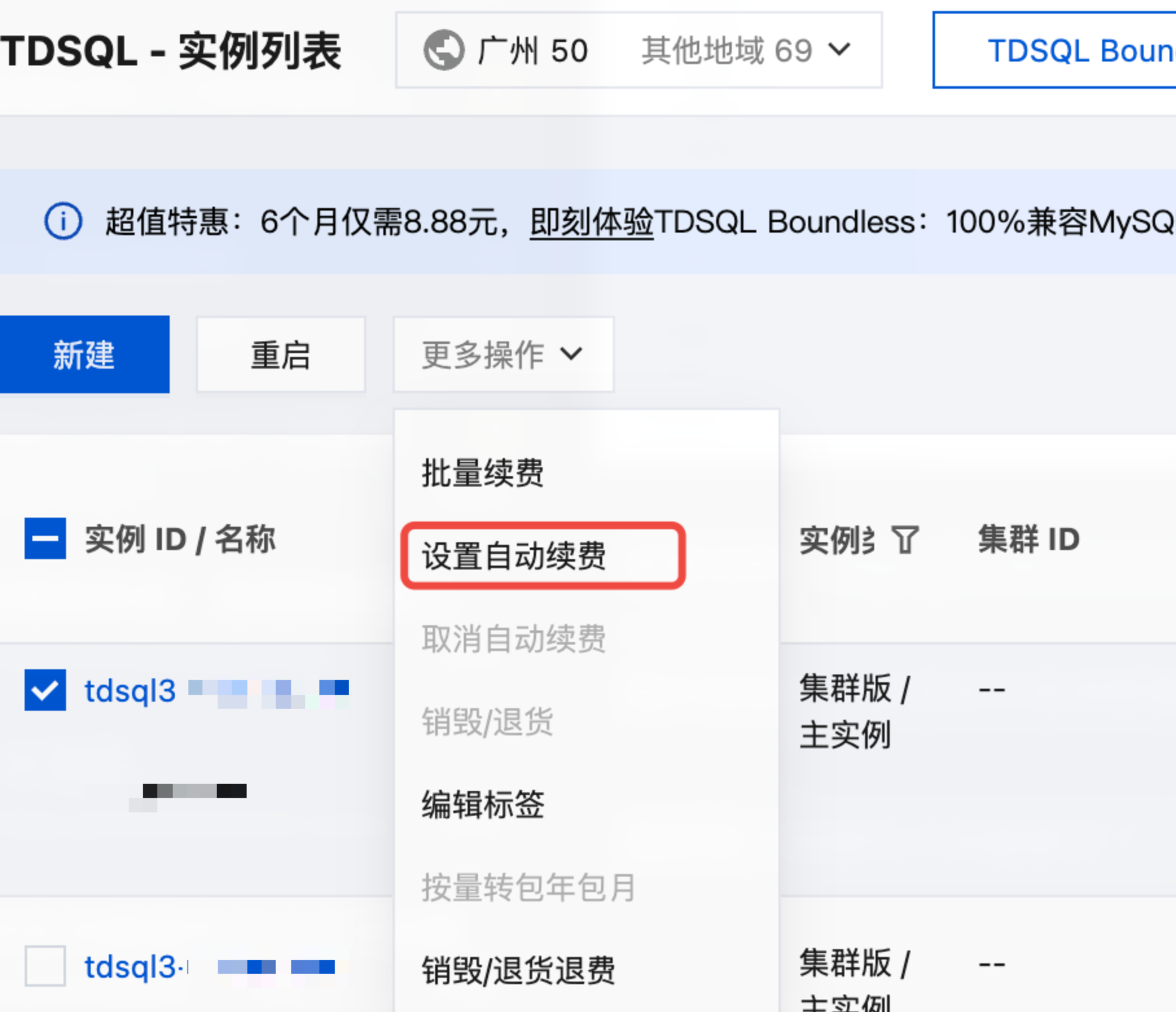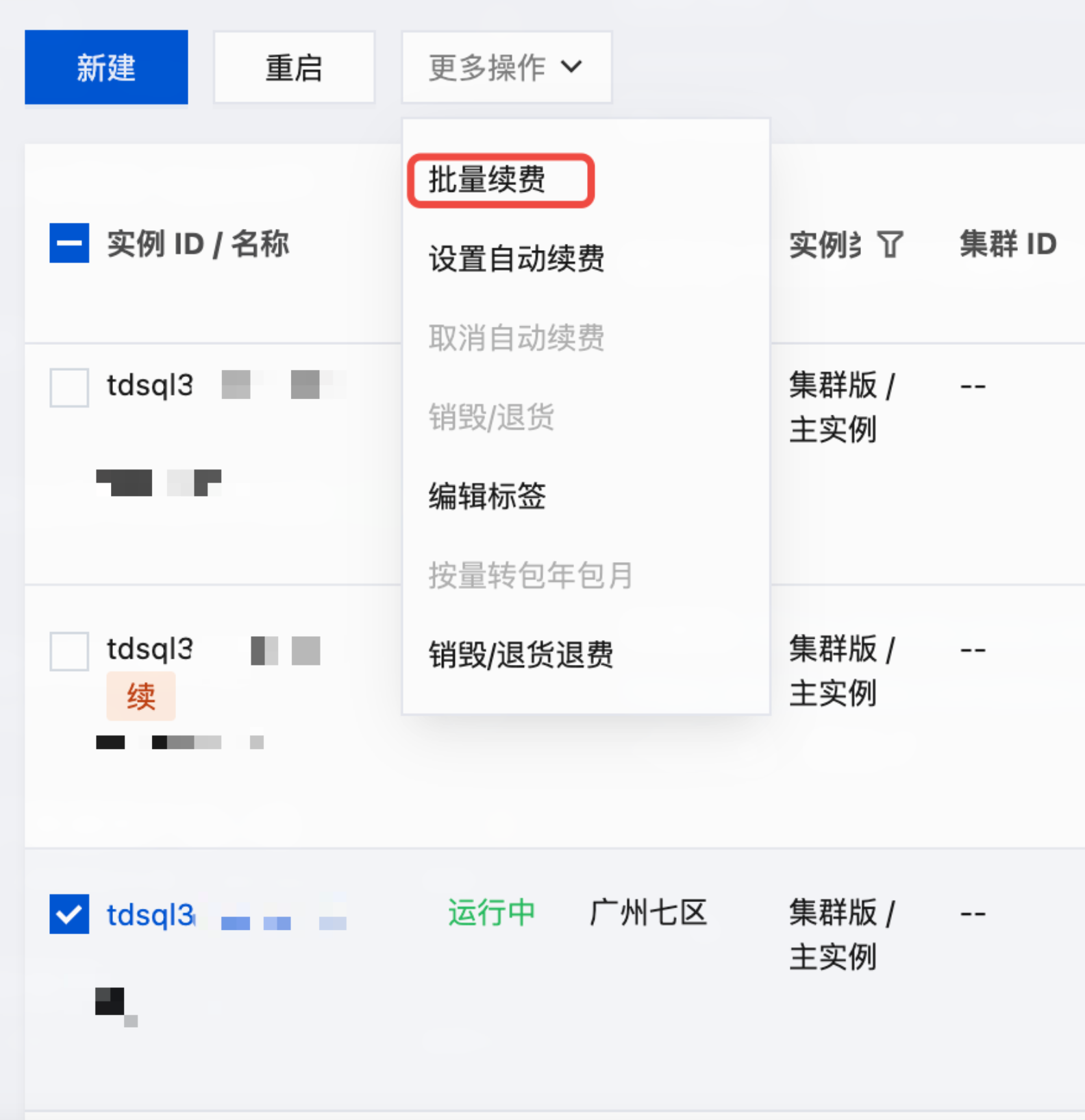 1. 登录TDSQL Boundless 控制台,在实例列表中选择所需实例,在上方操作栏选择更多操作 > 批量续费。