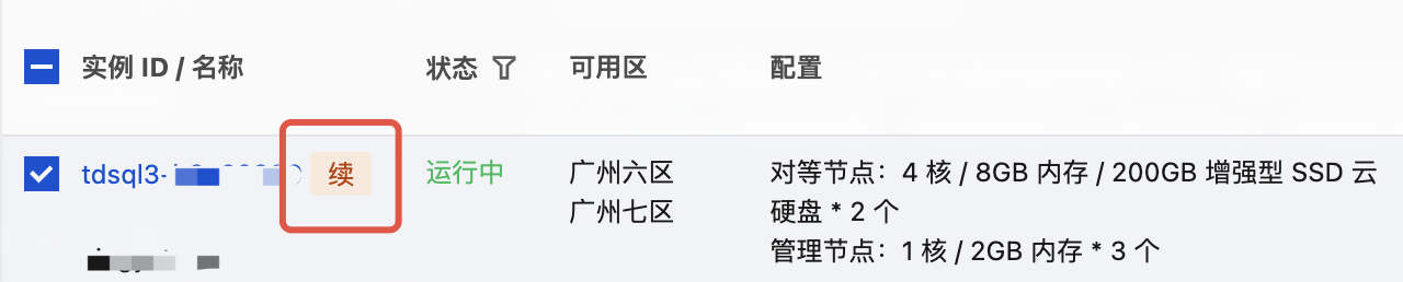 1. 登录费用中心,在左侧导航栏选择续费管理。选择需要续费的实例,单击续费。TDSQL Boundless 产品对应的资源 ID 开头为 “tdsql3-”。