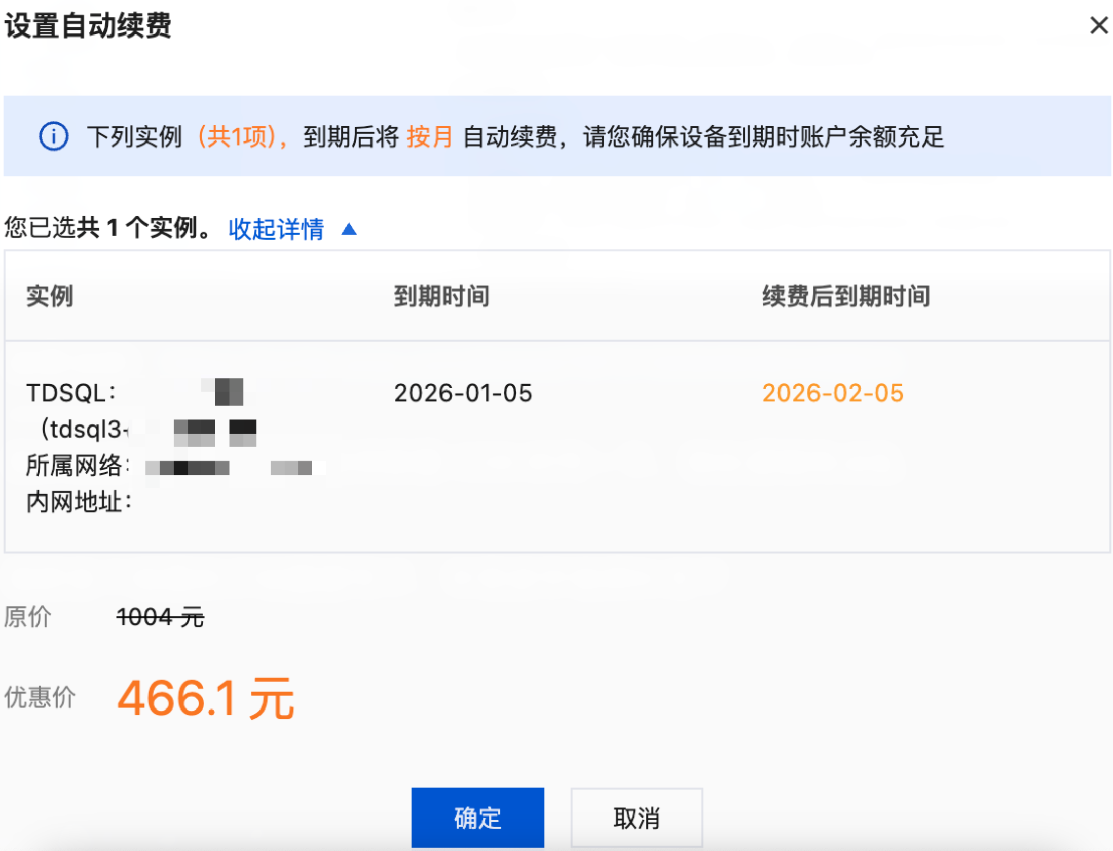 如下图所示,对话框中“到期后将 按月 自动续费”,表示设置了自动续费,每次该实例到期后都将自动往后续费1个月。