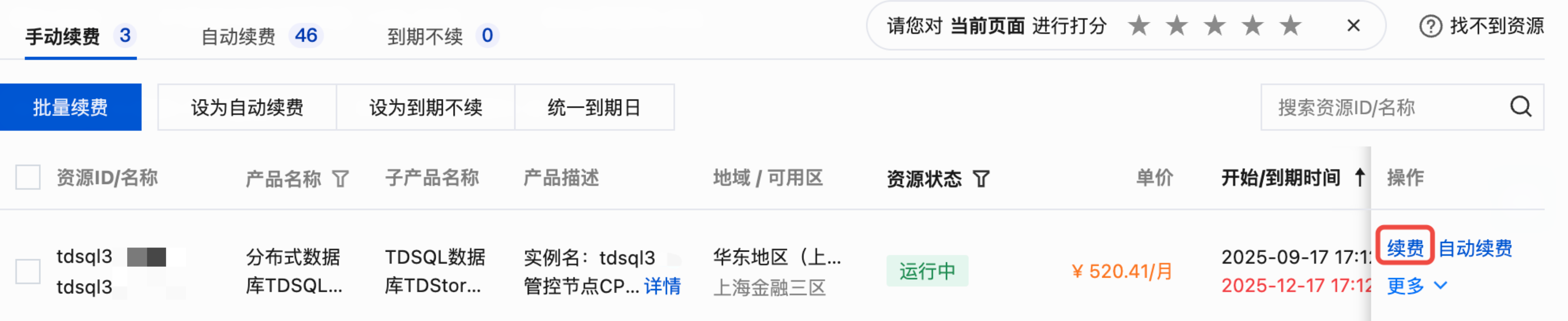 1. 登录费用中心 > 续费管理页面。TDSQL Boundless 产品对应的资源 ID 开头为 “tdsql3-”。