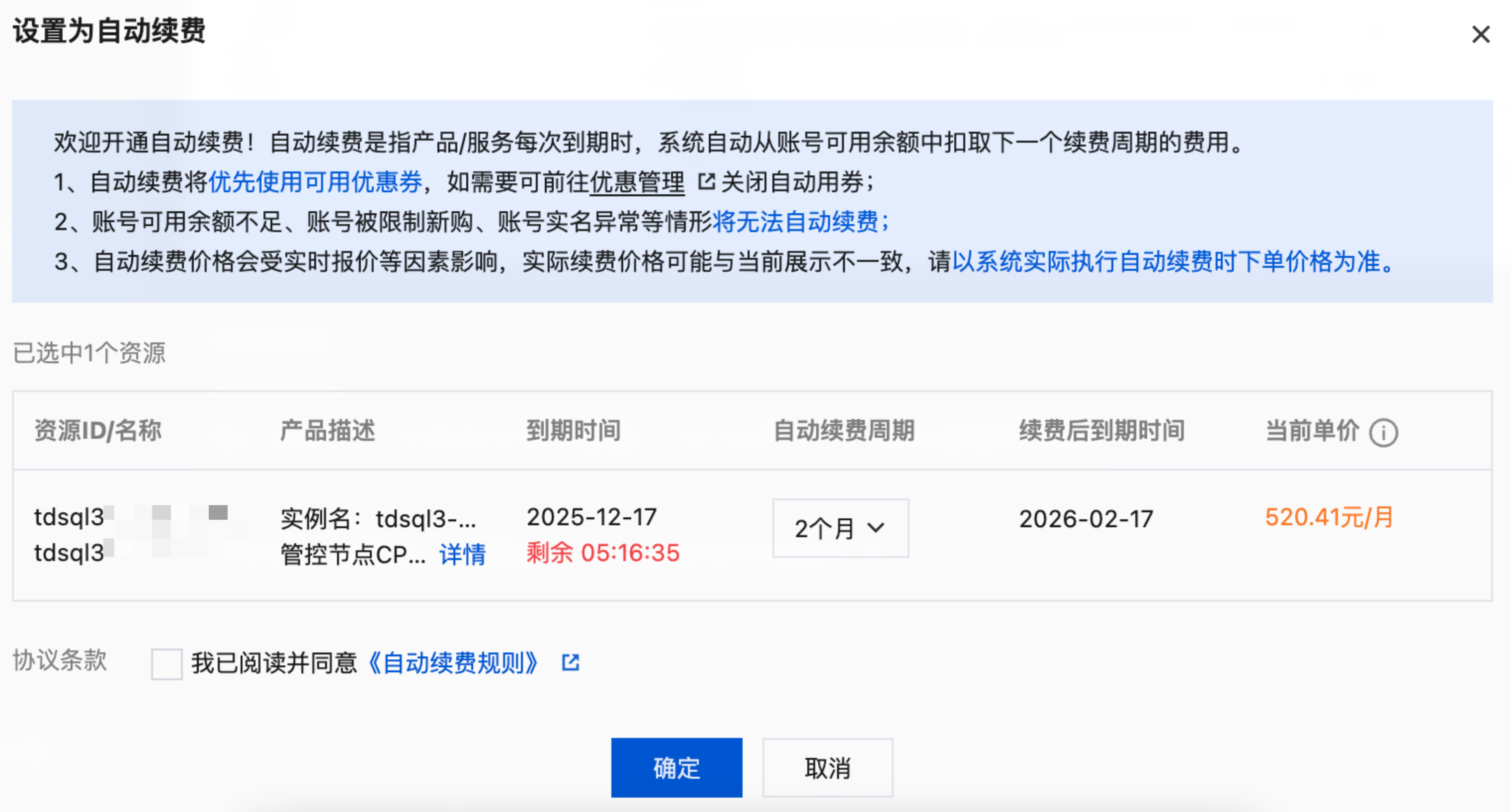 3. 在弹出的自动续费窗口,确认产品信息,选择自动续费周期,确认无误后,勾选我已阅读并同意《自动续费规则》,单击确定。