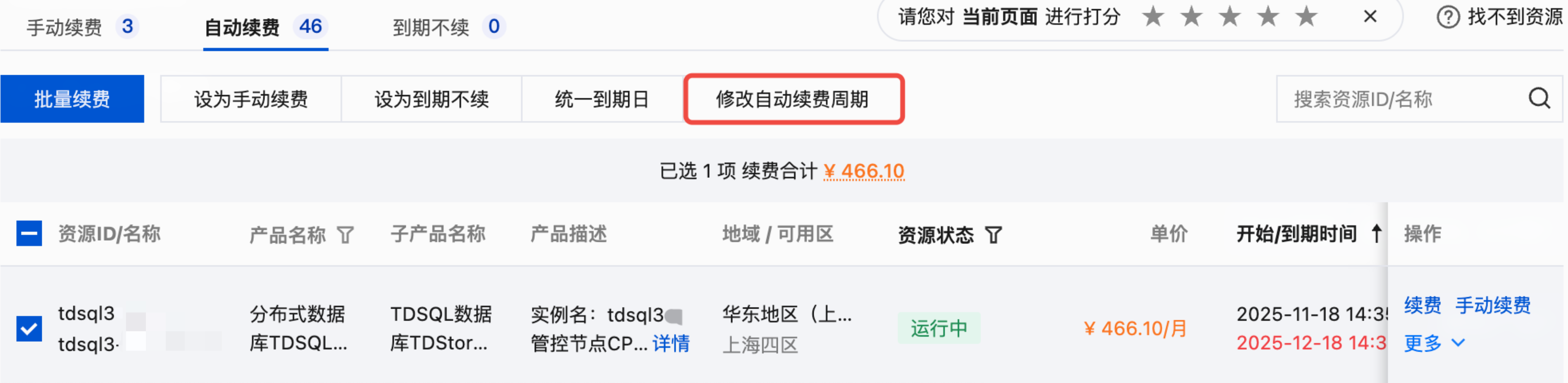 2. 在自动续费项下面,勾选您想要修改自动续费周期的一个或多个资源 ID 开头为 “tdsql3-” 的实例,单击修改自动续费周期。