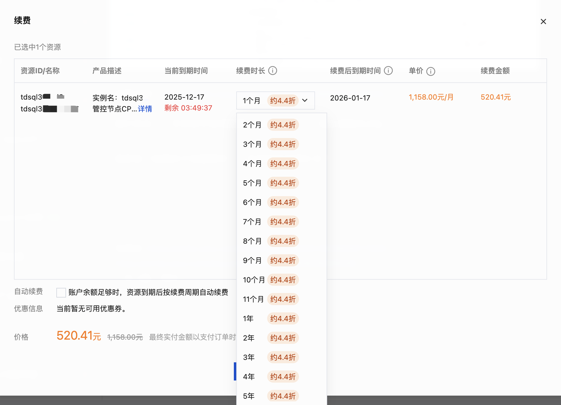 2. 在弹出的对话框中,选择续费时长,单击确定。