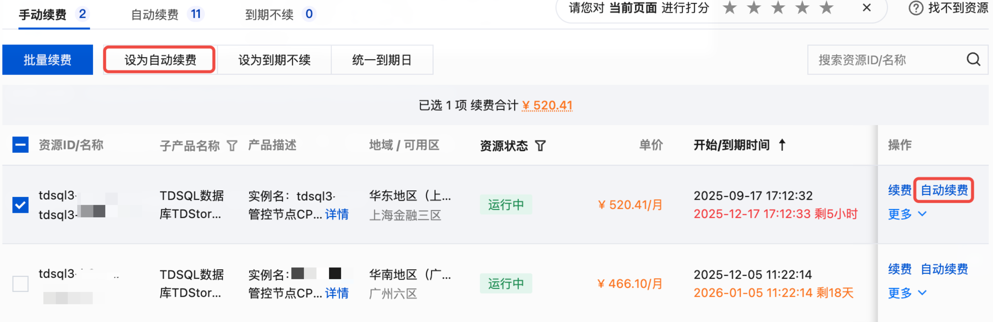 2. 在手动续费项下面,找到您想要设置自动续费的一个或多个资源 ID 开头为 “tdsql3-” 的实例,勾选后单击设为自动续费。