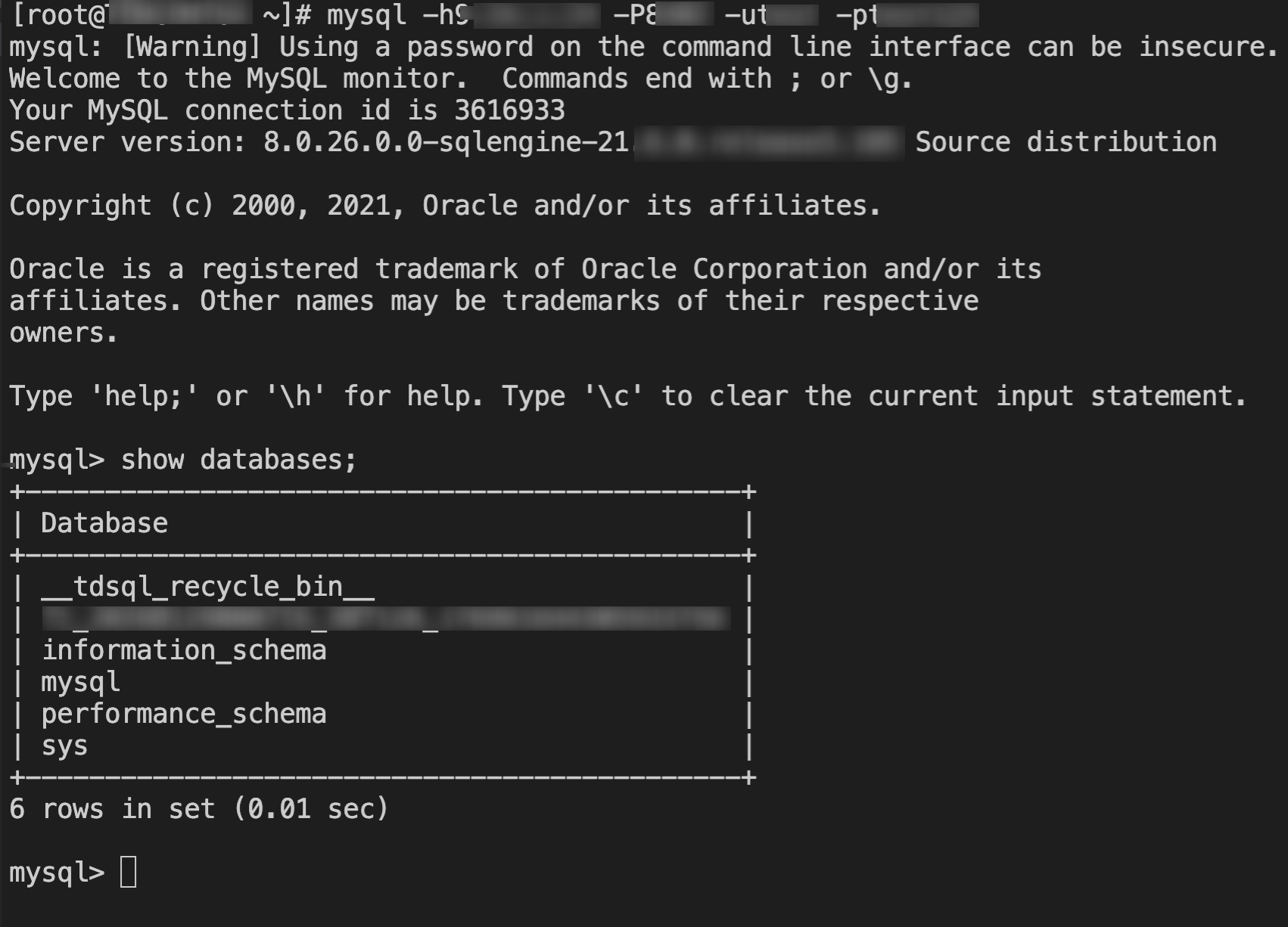 mysql -h内网地址 -P端口号 -u用户名 -pEnter password: **********(输入密码)