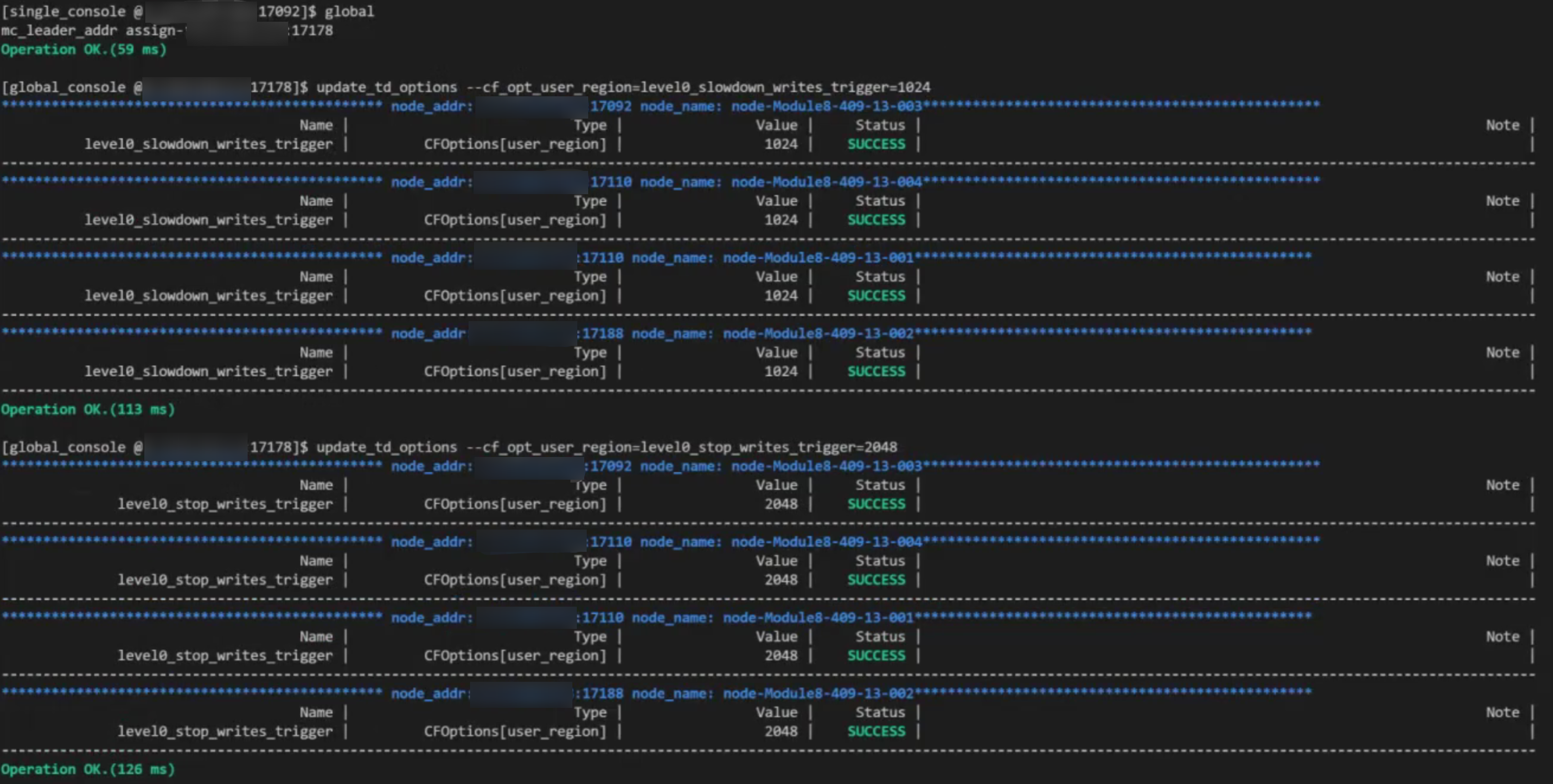 level0_stop_writes_trigger、停写状态阈值level0_slowdown_writes_trigger。update_td_options --cf_opt_user_region=level0_stop_writes_trigger=2048update_td_options --cf_opt_user_region=level0_slowdown_writes_trigger=1024
