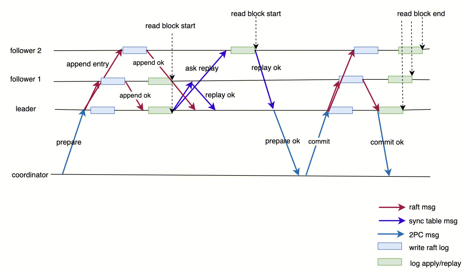 Follower 上收到读请求时不能再直接报错,而是需要检查可读性(包括 lease 检查等),可读性检查通过后读的逻辑和 Leader 上一致,即先检查锁信息看是否有处于 prepare 状态的事务需要阻塞自己,没有则直接根据读版本号读取 RocksDB。