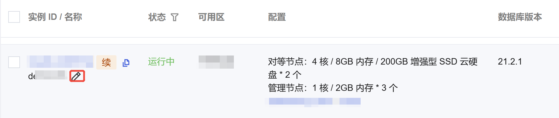 1. 登录 TDSQL Boundless 控制台,在实例列表中,找到要修改的实例,单击实例名后的