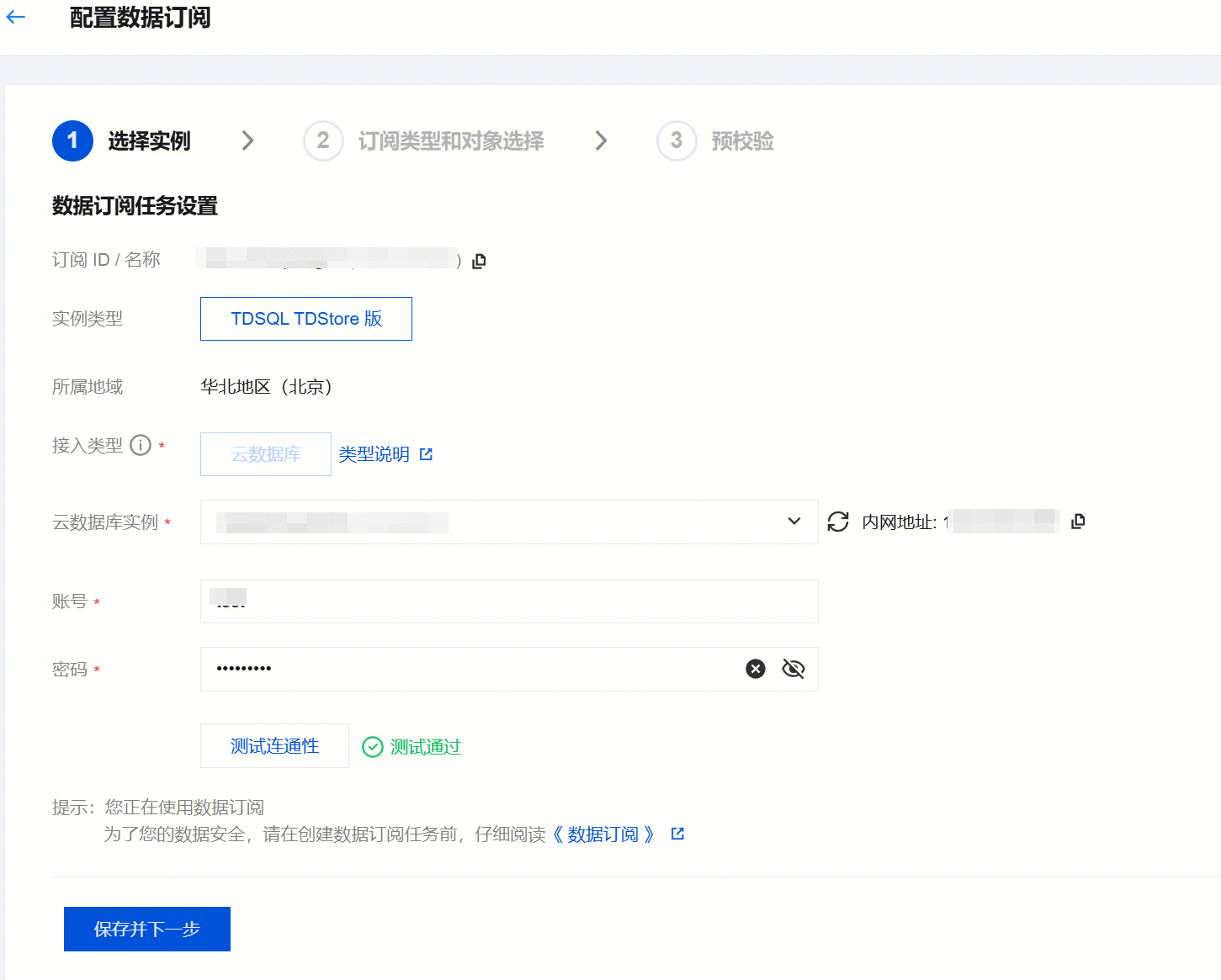 4. 配置数据订阅页面,选择源数据库相应配置,完成后单击测试连通性,测试通过后单击保存并下一步。