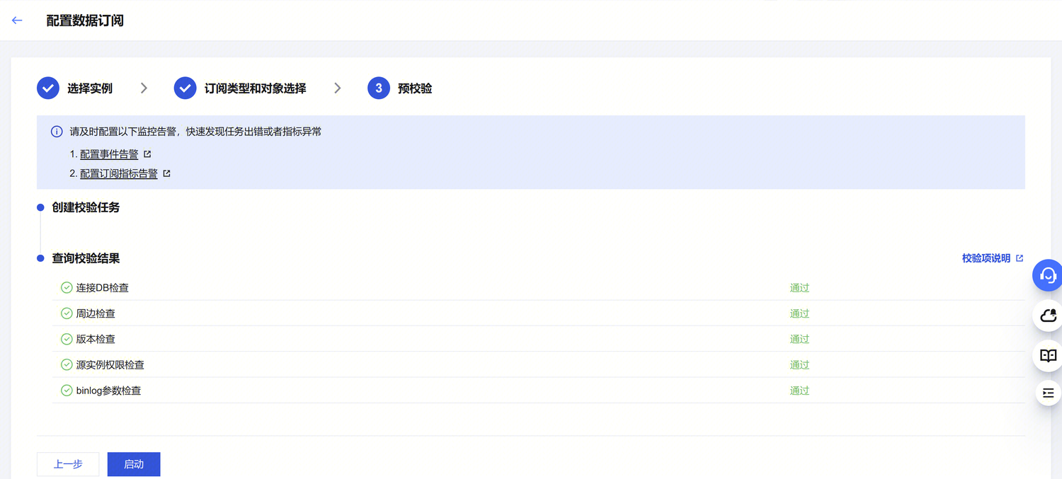 6. 在预校验页面,预校验任务预计会运行2分钟 - 3分钟,预校验通过后,单击启动完成数据订阅任务配置。