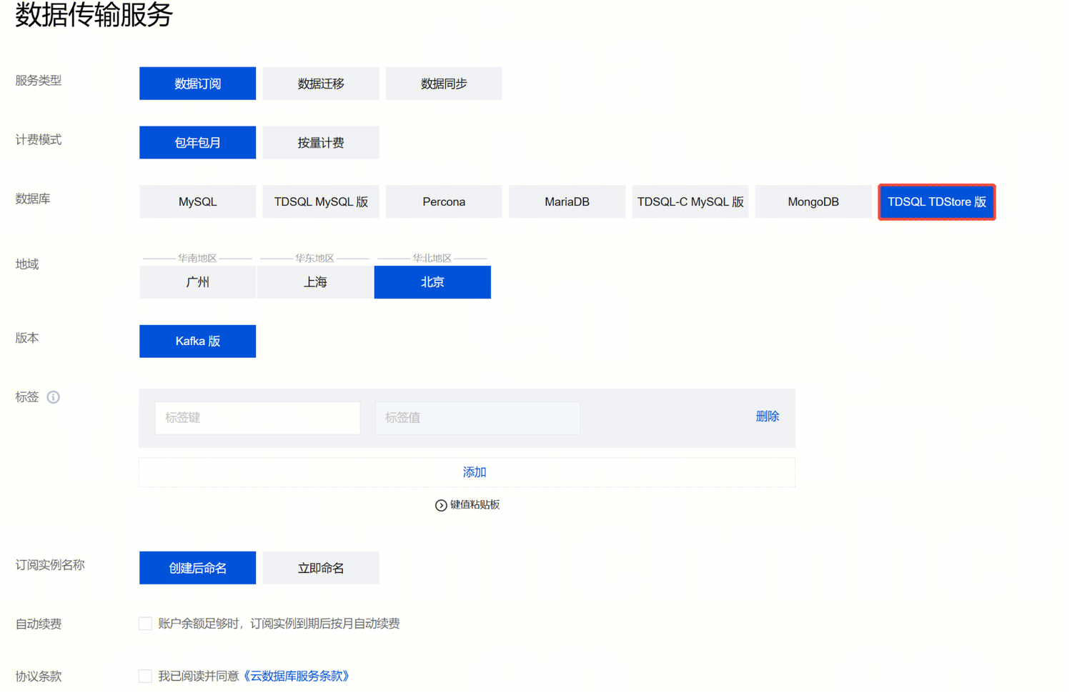 2. 在新建数据订阅页,选择相应配置,单击立即购买。