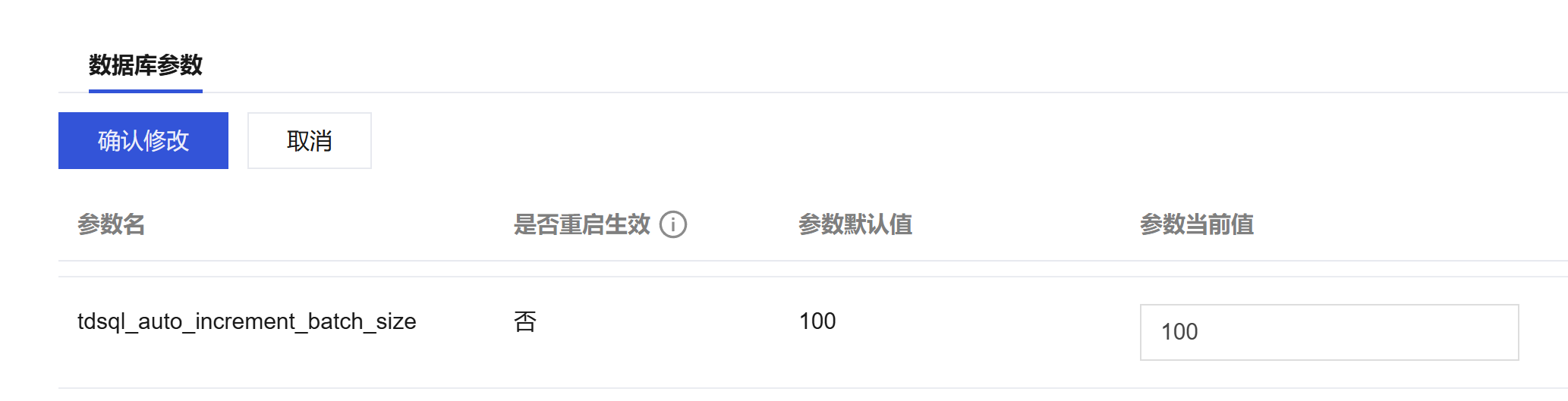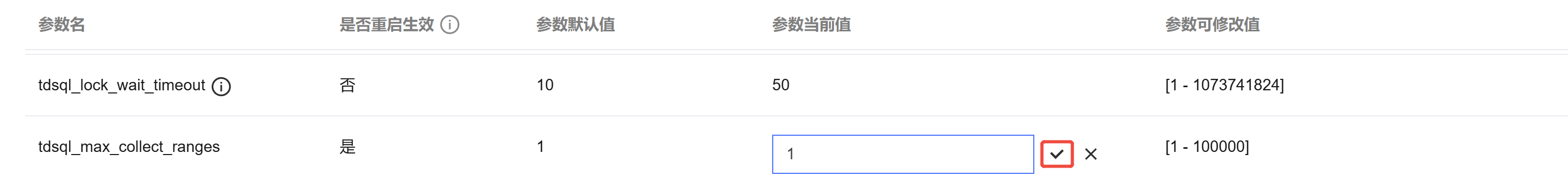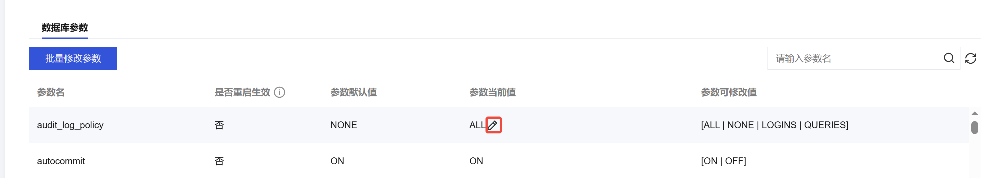 2. 选择参数配置 > 数据库参数页签,选择目标参数所在行,在参数当前值列,单击