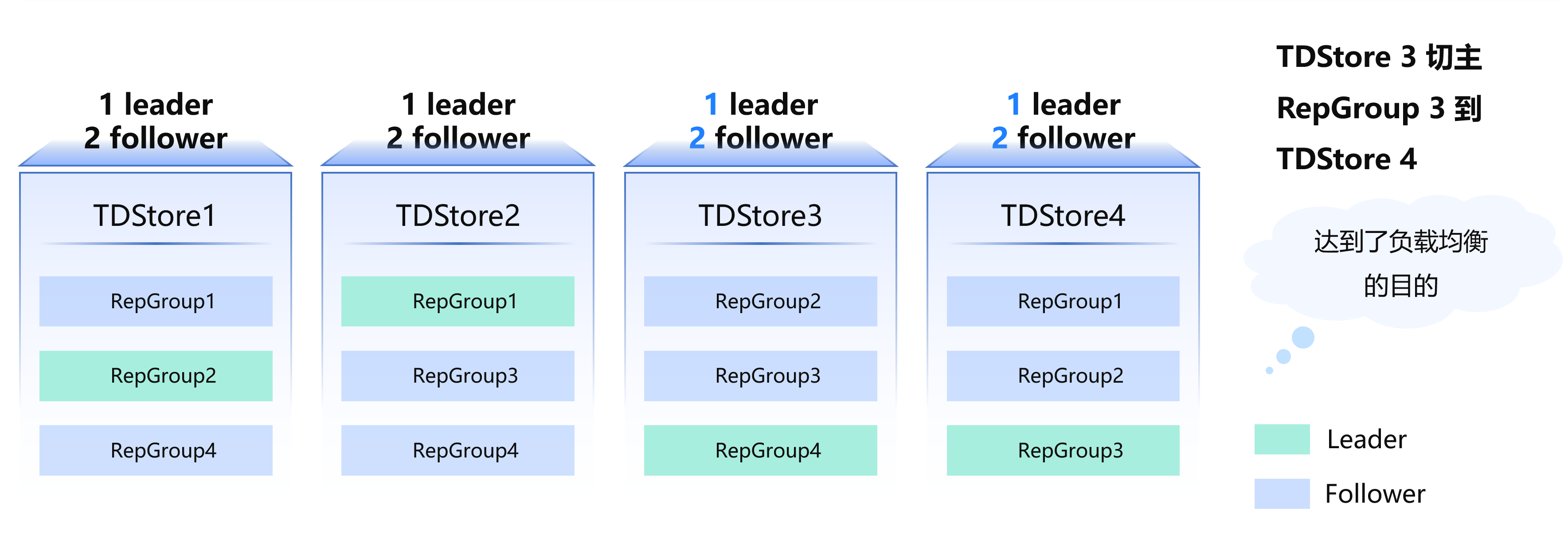 如下所示, TDStore3 节点同时承担两个 Leader 副本和一个 Follower 副本,读写压力集中,可通过切主将部分 Leader 转移至其他节点(如 TDStore4),从而均衡集群负载。切主执行流程: