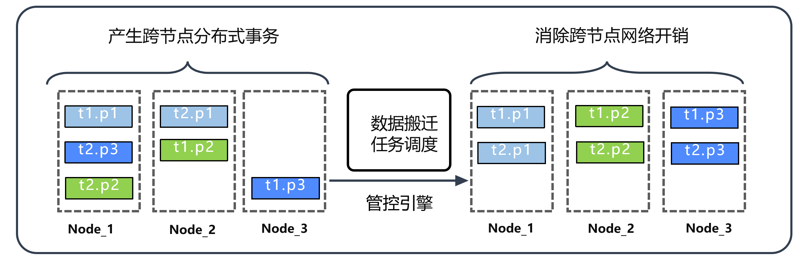 下图左边为未启用亲和性调度时,数据分布分散,关联查询需跨节点访问,网络开销大。集群扩容时,均衡策略可能进一步打散相关数据(如将 t1.p3 迁移至新节点 node3),加剧性能损耗。