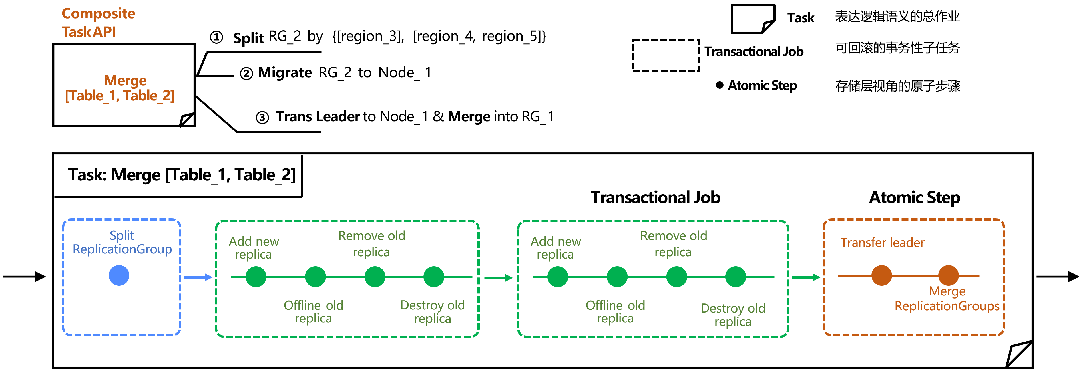 4. 切主并合并 Region:框架下发第三个原子任务——“将相关 RG 的主副本切换(Transfer Leader)”,以确保两个 RG 的数据处于同分布状态。在所有前置步骤成功后,框架下发最终的原子任务——“合并指定的 RG。