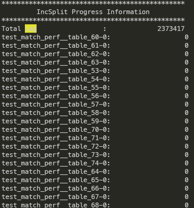 工具会打印出增量同步时,每张表在 Kafka 中的 LAG,即增量数据消费情况。