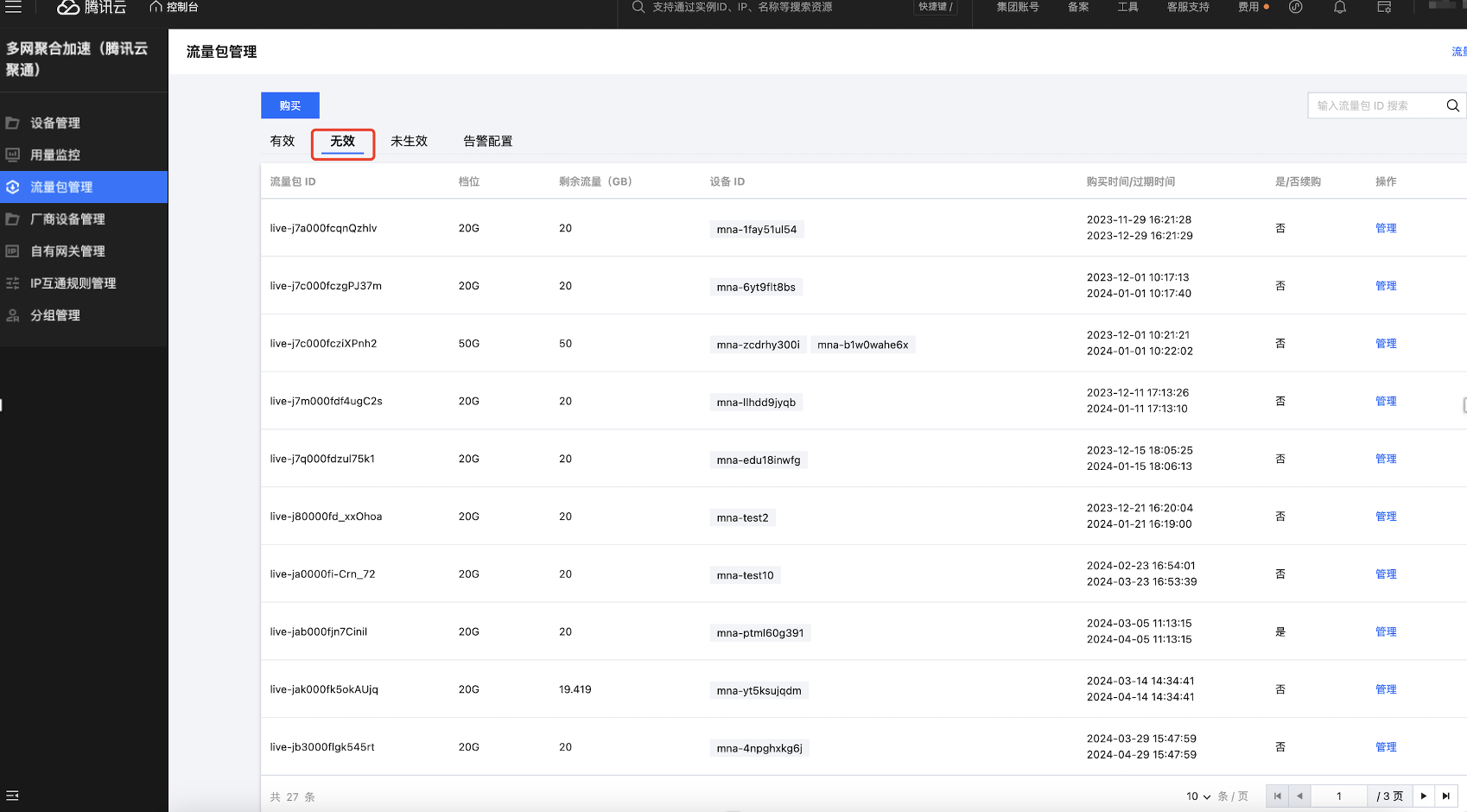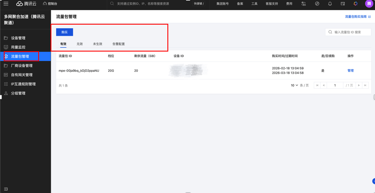 多网聚合加速(腾讯云聚通)支持通过控制台查看账号下的流量包使用情况,您可单击左侧栏流量包管理,在流量包列表中可查看有效流量包、无效流量包和未生效流量包及告警配置。