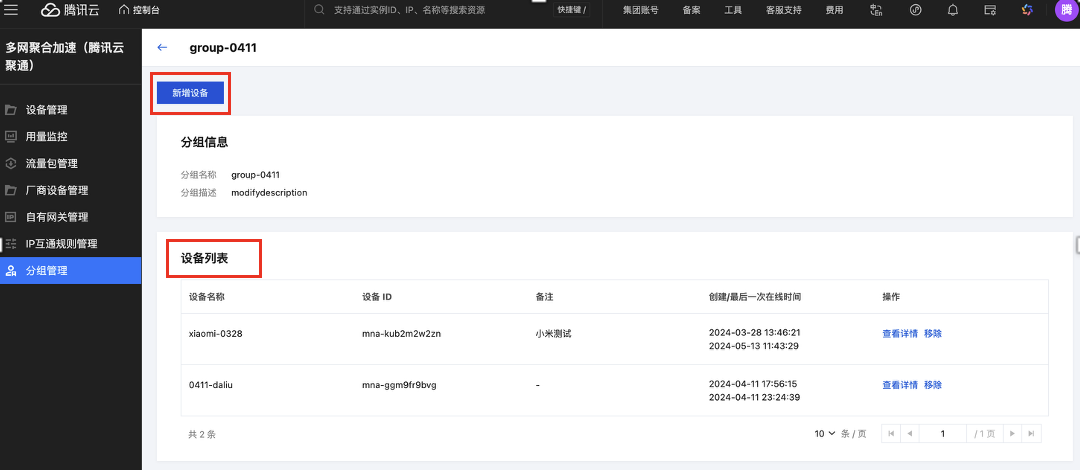 在多网聚合加速(腾讯云聚通)分组管理页面,您可以对设备进行分组管理,查看以组为单位的加速统计数据。