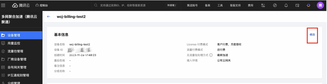 在基本信息卡片中,单击修改,即可修改设备名称和备注字段。