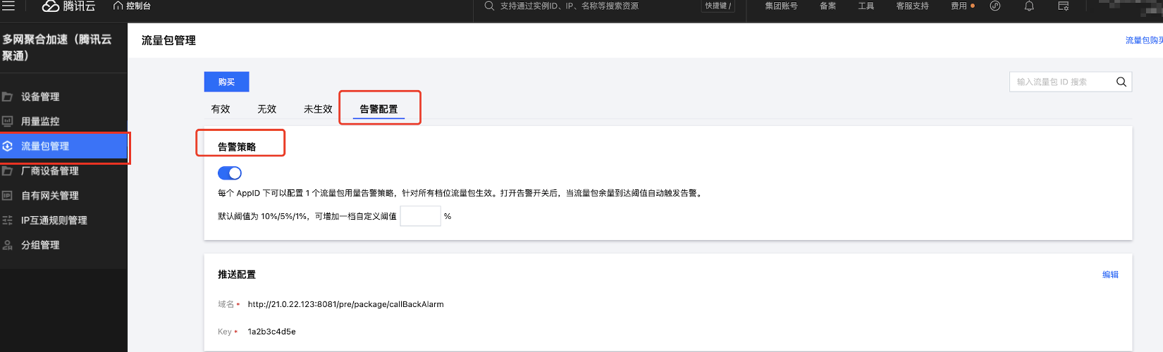 多网聚合加速(腾讯云聚通)支持设置流量包告警配置,当流量包余量消耗至告警线时,将收到告警提醒。