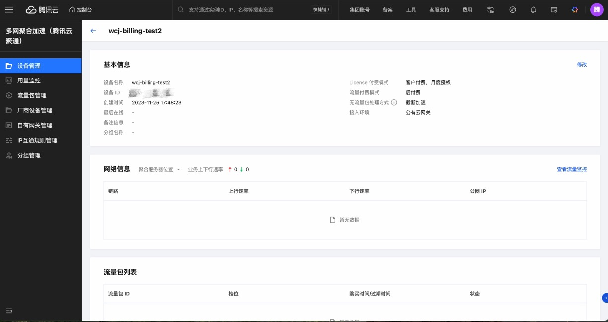设备详情页面展示设备信息和设备相关的网络情况,展示聚合服务器节点和上下行速率统计,同时展示流量包列表。