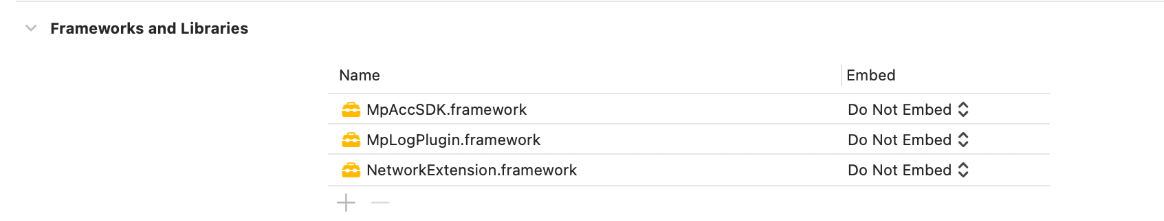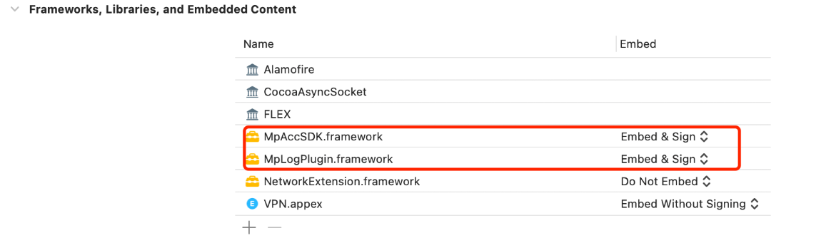 App Target 下配置 MpAccSDK 和 MpLogPlugin,具体如下图:
