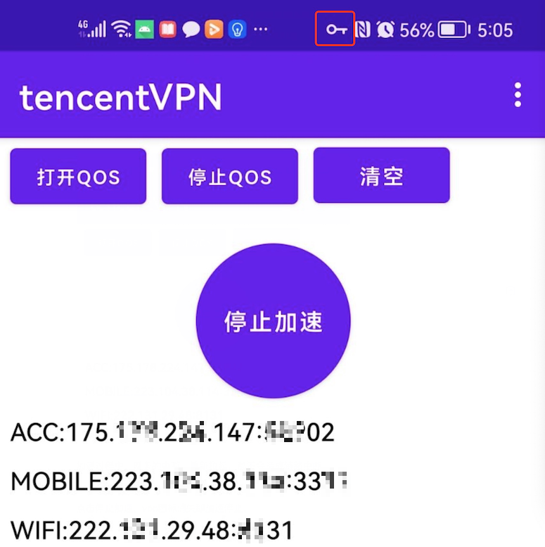 单击开始加速,同意 VPN 权限,出现 VPN 图标(不同手机厂商有所不同),如下图: