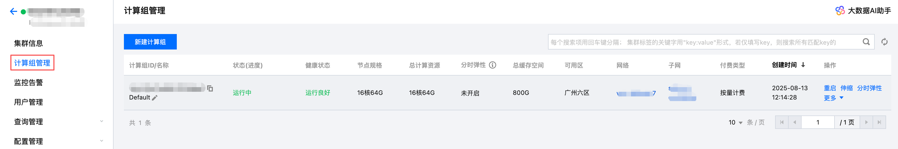 1. 登录 腾讯云数据仓库 TCHouse-D 控制台,在存算分离集群列表中单击 集群 ID/名称,并在左侧菜单栏中切换至 计算组管理 页面。