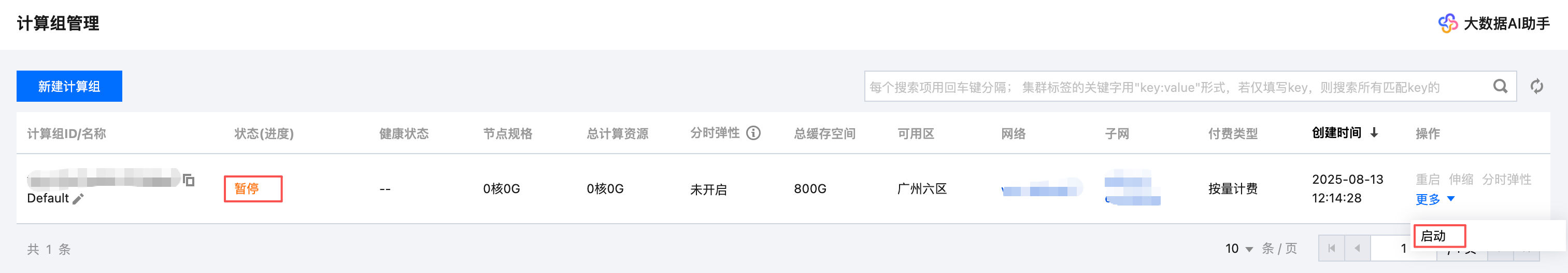 对于暂停中的计算组,单击计算组列表中的 操作 > 启动,并在弹窗中单击 确定 按钮,即可启动该计算组,并正常计费。