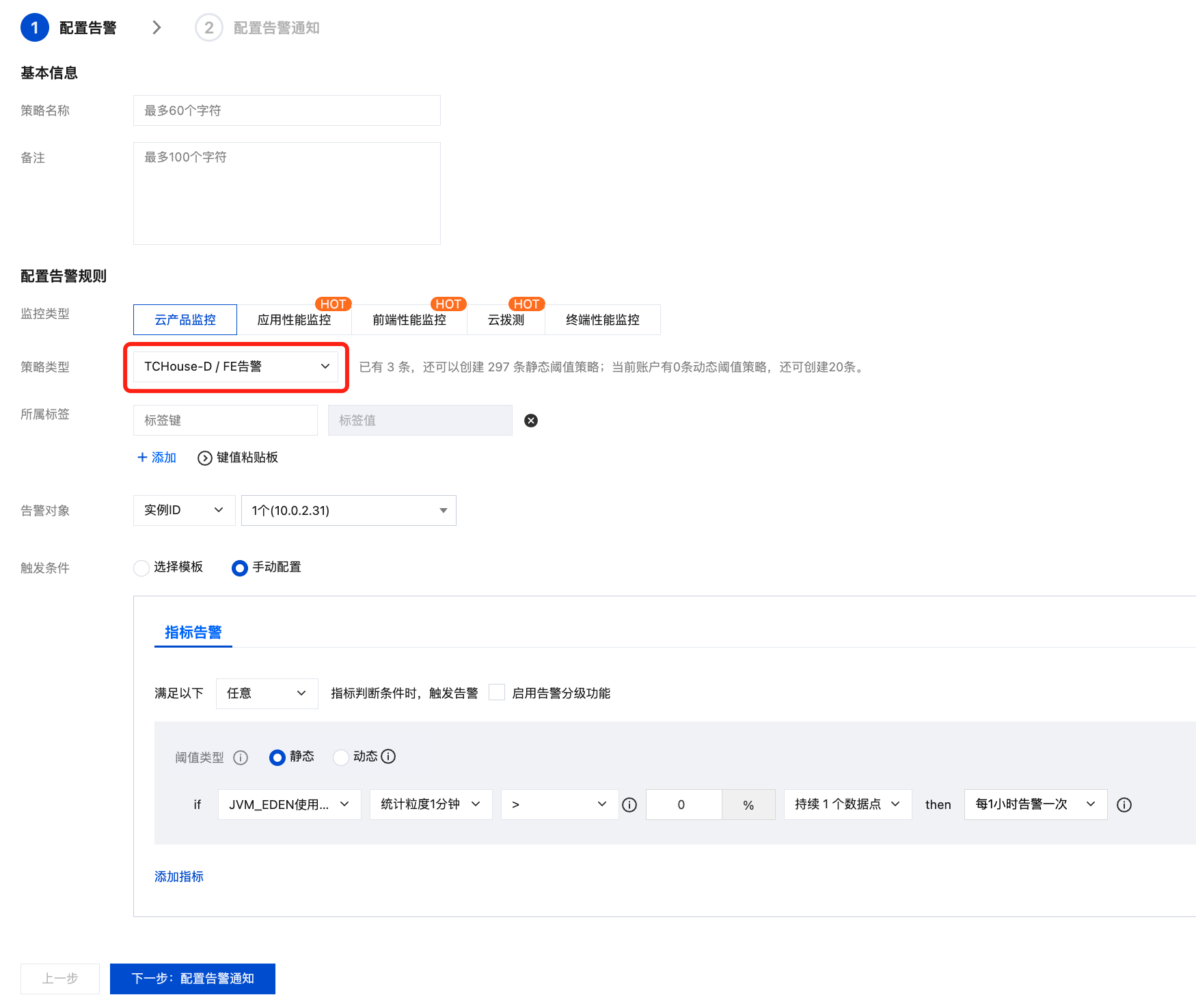 对业务监控指标配置监控告警时,您需要在策略类型中选择“TCHouse-D/FE 告警”,原因是该类指标的监控事实上依赖 FE 节点。