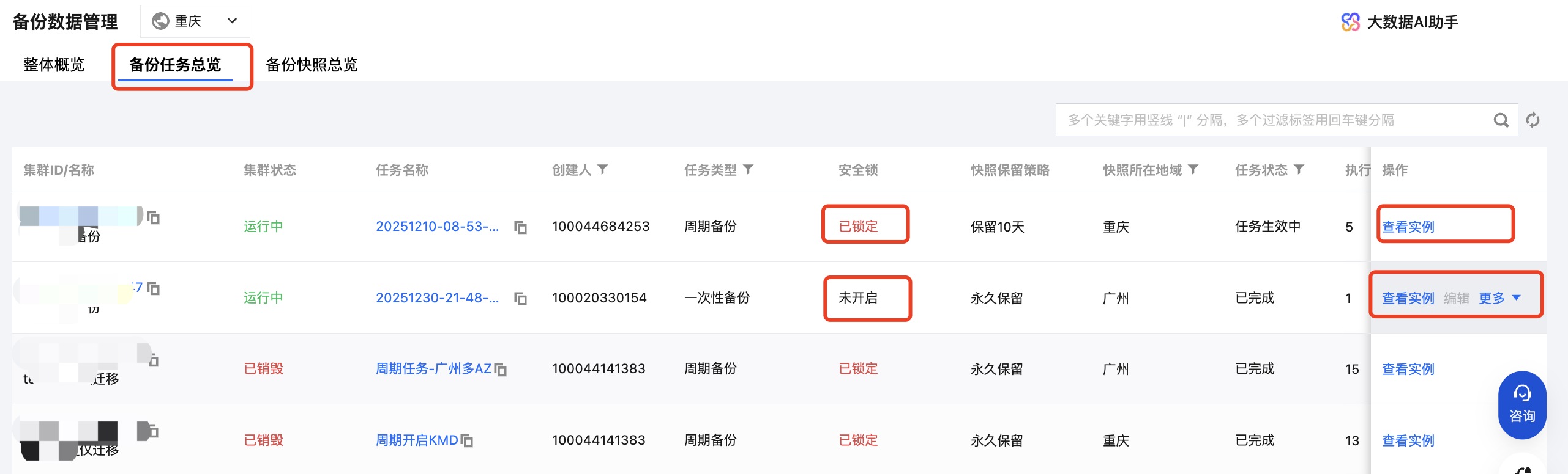 1. 备份任务总览页面提供集群-备份任务粒度的详细信息,可观测到任务归属集群、备份任务类型、是否开启安全锁、保留策略、任务状态、执行次数和现存实例等信息。