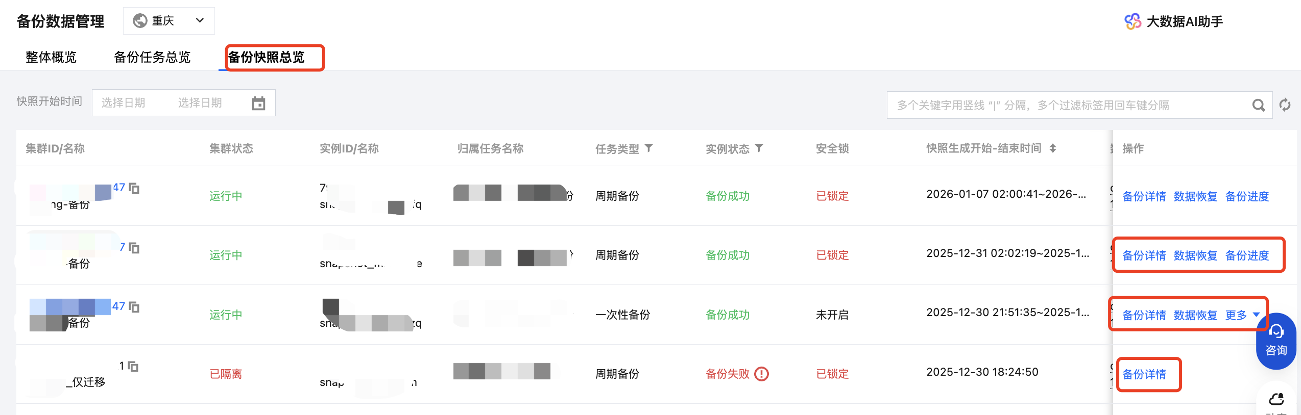 支持地域级的备份功能的集群列表信息,支持查看当前备份任务数、已锁定备份任务数、备份快照数及已锁定备份快照数等信息。
