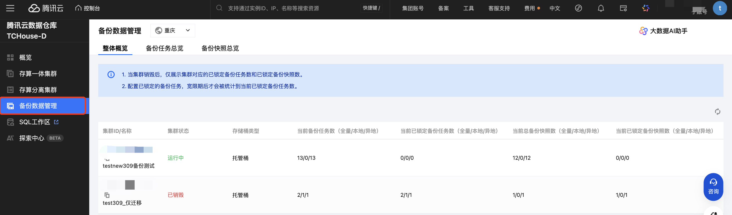 腾讯云数据仓库 TCHouse-D 提供备份数据管理功能,方便您集中管理备份的数据。