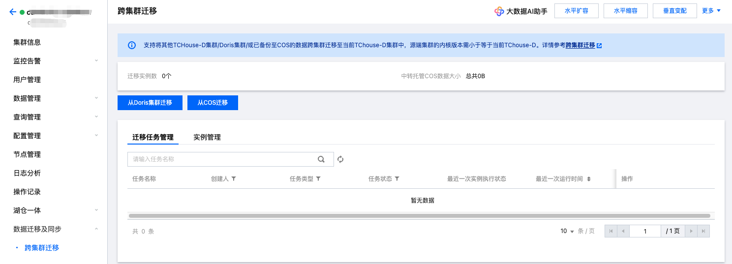 2. 在集群管理页中,单击左侧 数据迁移及同步 > 跨集群迁移 进入跨集群迁移页面,填写具体配置信息。
