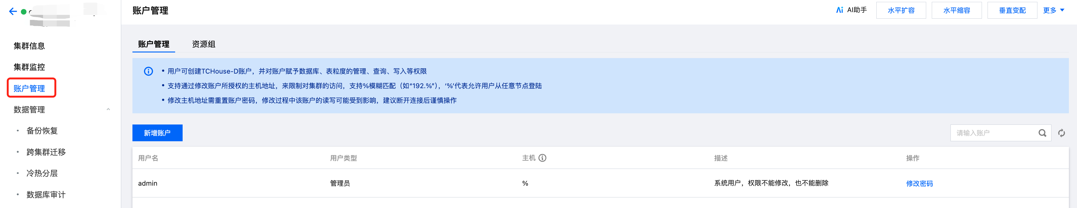 腾讯云数据仓库 TCHouse-D 在控制台中提供了一个可视化界面,能够对集群便捷、高效地开展账户管理、权限管理操作。
