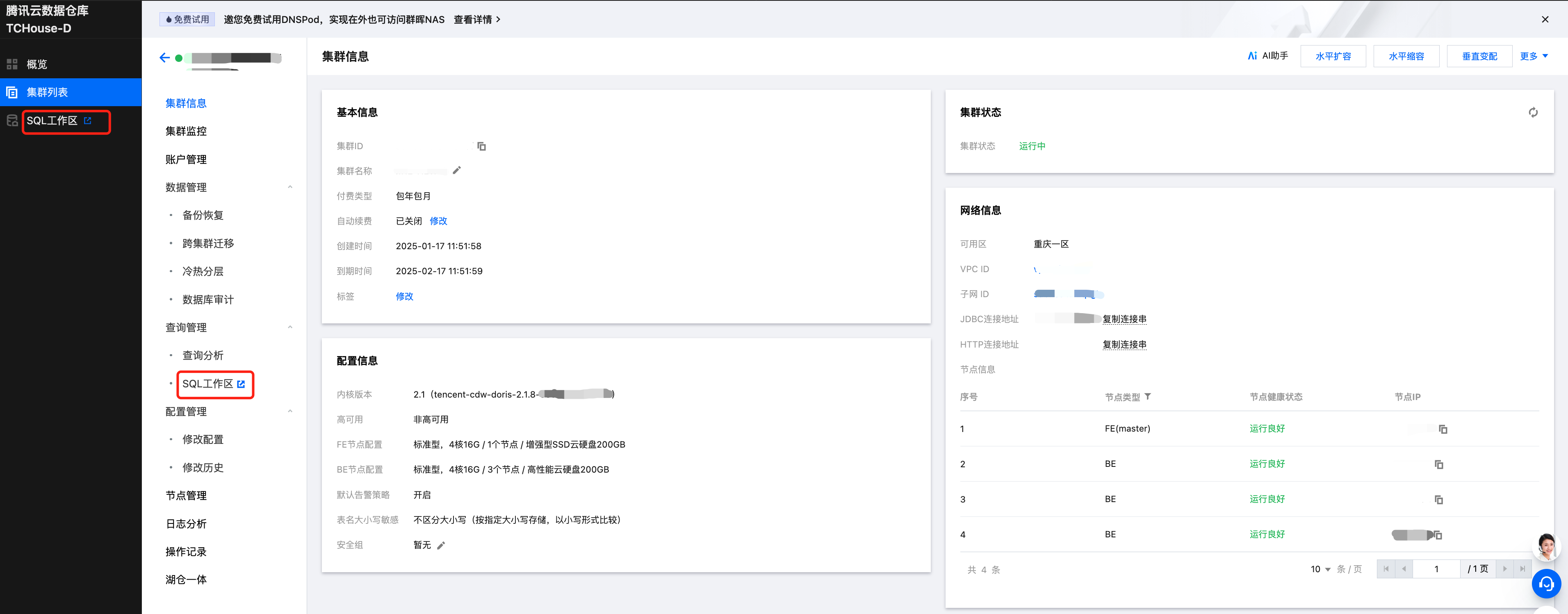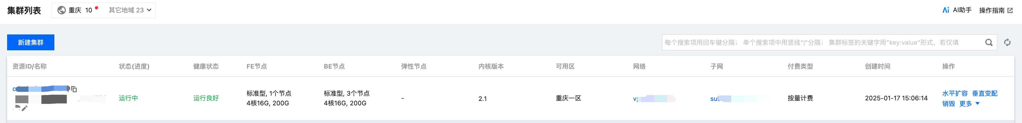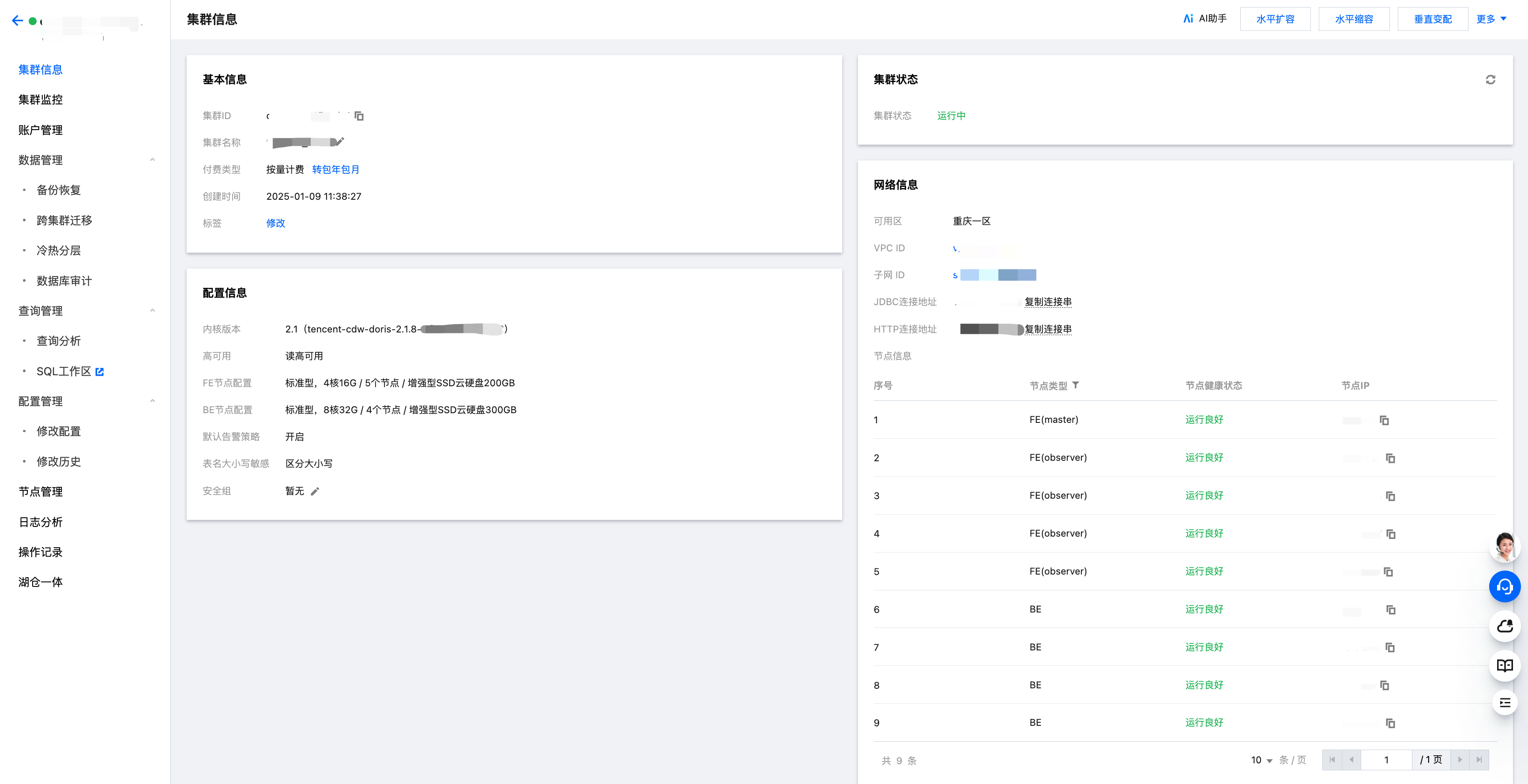 在集群列表单击 集群 ID/名称,可以查看集群基本信息、集群状态、配置信息和网络信息等。